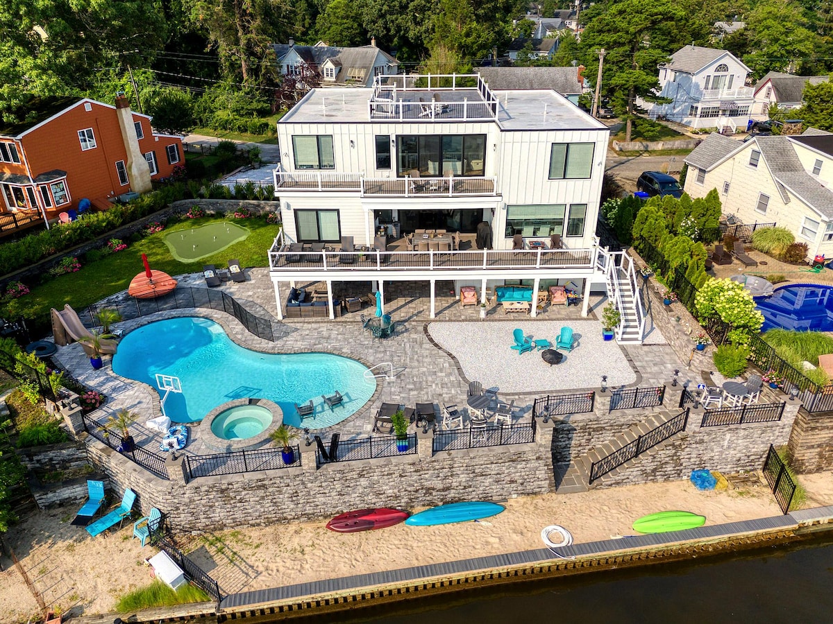 Enjoy waking up to a beautiful jersey shore sunrise over the water listening to the sound of the waves while sipping your morning cup of coffee on one of our outdoor balconies. Relax while you sunbathe on the outdoor patio/rooftop, take a dip in our pool/hot tub, a fun ride down the slide, a nice kayak ride to fcove to break up the day, & then enjoy a sunset cocktail on our mini beach. Entertain w the poolside bar & fire pit. Private community beach & brick public beach access (we supply badges)