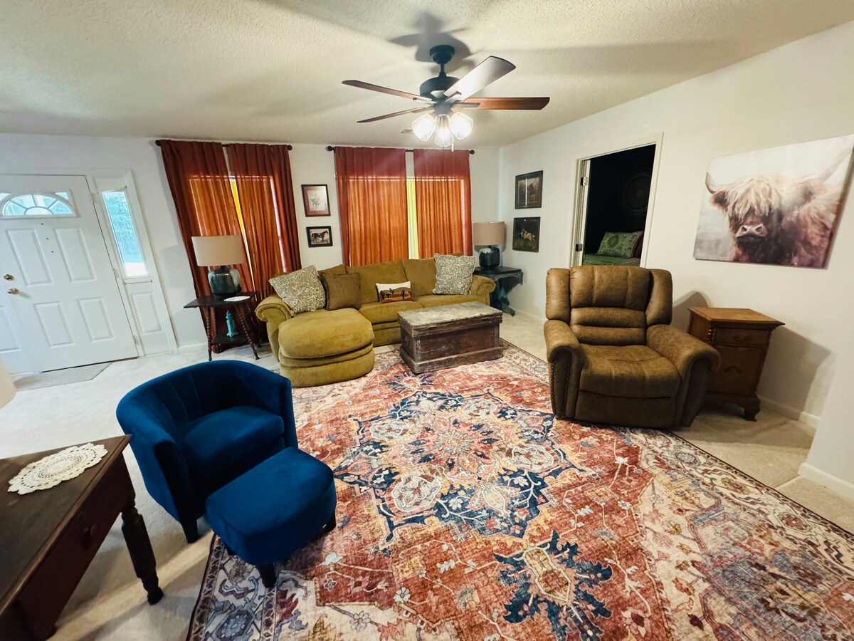 Forget your worries in this spacious and serene space. Enjoy time with family or friends in a peaceful country setting. Conveniently located only 10 minutes from shopping and local restaurants. Full kitchen available if you prefer to prepare a meal and enjoy dining on the outdoor covered patio. A great place to stay for work or play.