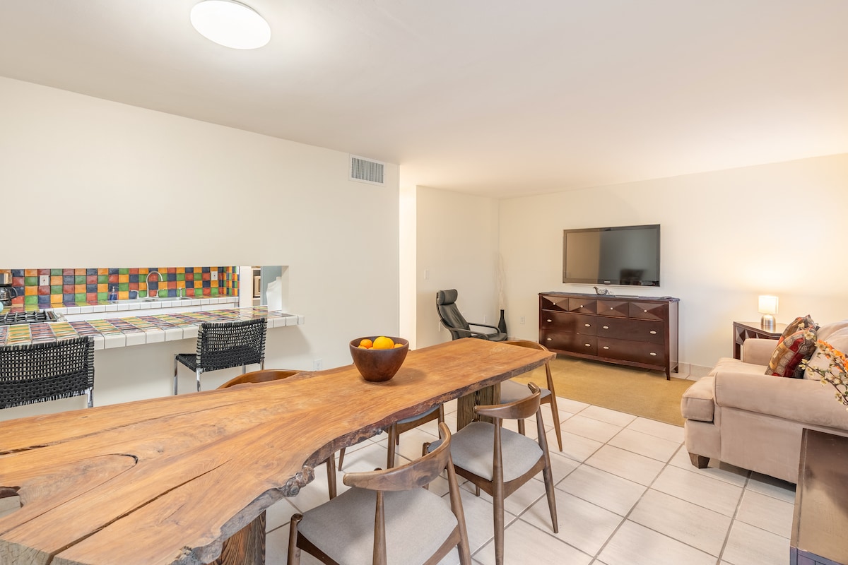 KITCHEN & DINING: The kitchen is fully stocked (100-piece culinary set) and has a full line of new appliances (blender and drip coffee maker included). The dining area has seating for 6 and the kitchen bar has seating for 2, a dining table with sating for four, along with all the necessary dinnerware, and more.