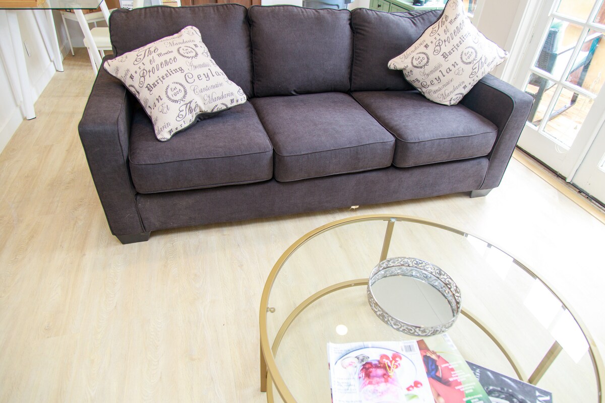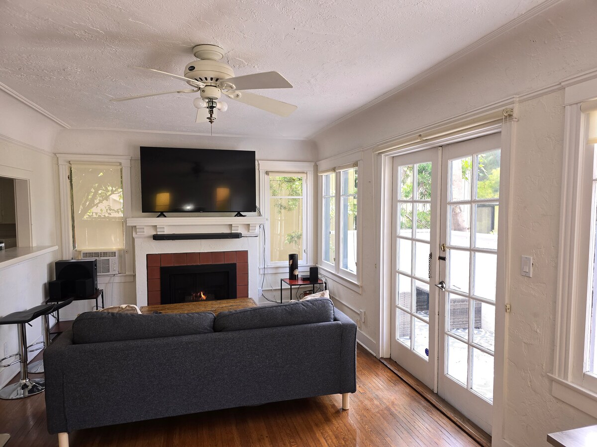 The office studio is equipped with a large desk and desk chair, loveseat sofa, and split ac/heater. In both the main house and the studio there is a 1 GB fiber hardwire connection, as well as wifi, which makes this a perfect place to do remote work. This studio is also well suited to use as a music room or private yoga studio.