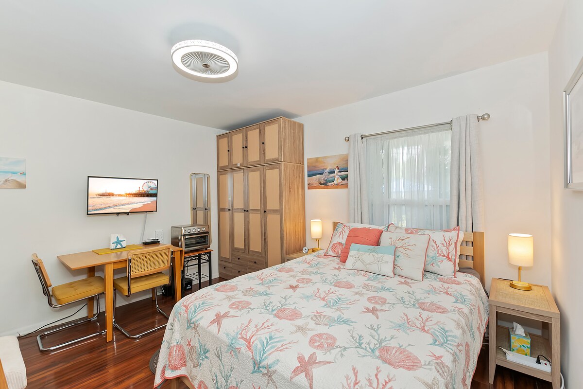 Private & quiet while being close to local restaurants and the beach; our Santa Monica Canyon 2025 stand alone Guesthouse is perfectly located with easy access to Santa Monica & neighboring communities. Beautiful patio for dining and lounging, this is a real hidden gem. A fully equipped kitchen; including a past-through window to an outdoor patio area with a countertop bar and bar stools. Convenient for outdoor dining & entertaining. Firepit and outdoor heater allow for year-round enjoyment.