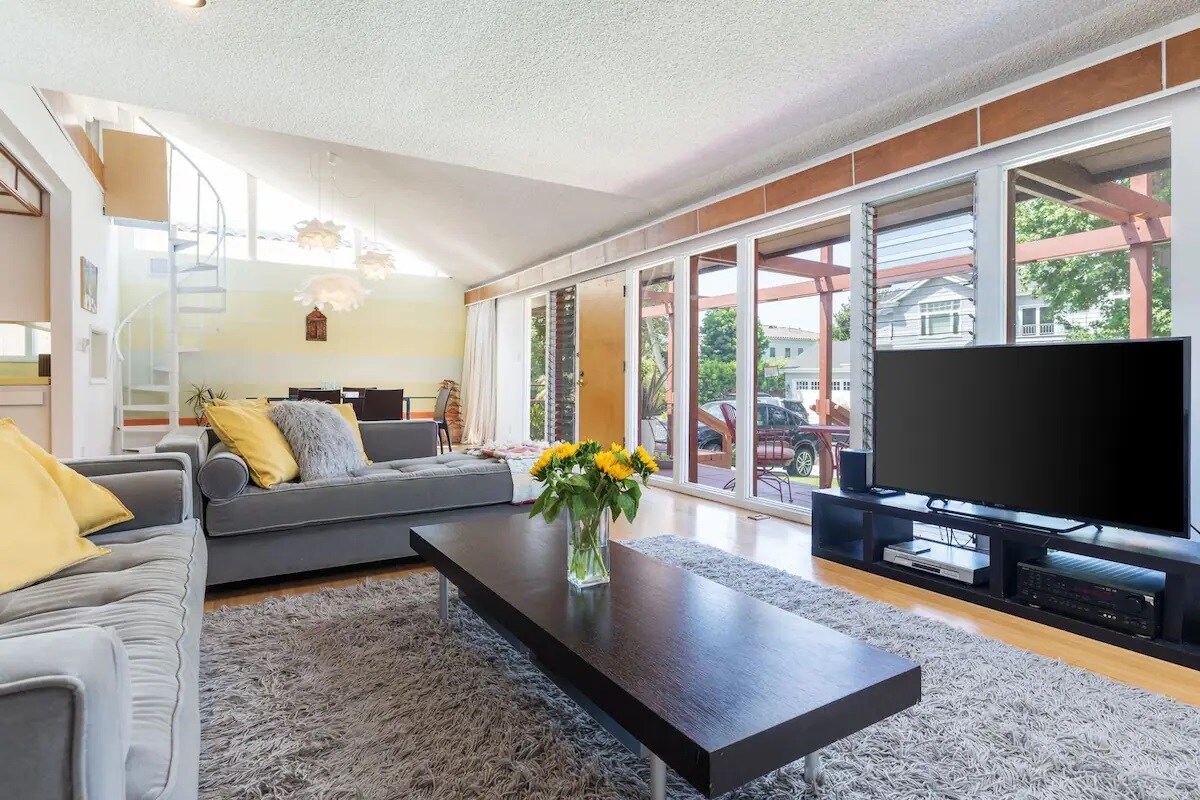 When you step inside you’ll find large picture windows and french doors that access the private back patio abundant with plants native to Southern California. Beautifully curated open living and dining areas include a large couch, 65” Frame TV, and a dining table with seating for seven. Skylights add to the natural light of the space that is artfully decorated and thoughtfully stocked with games, books, and knick knacks.