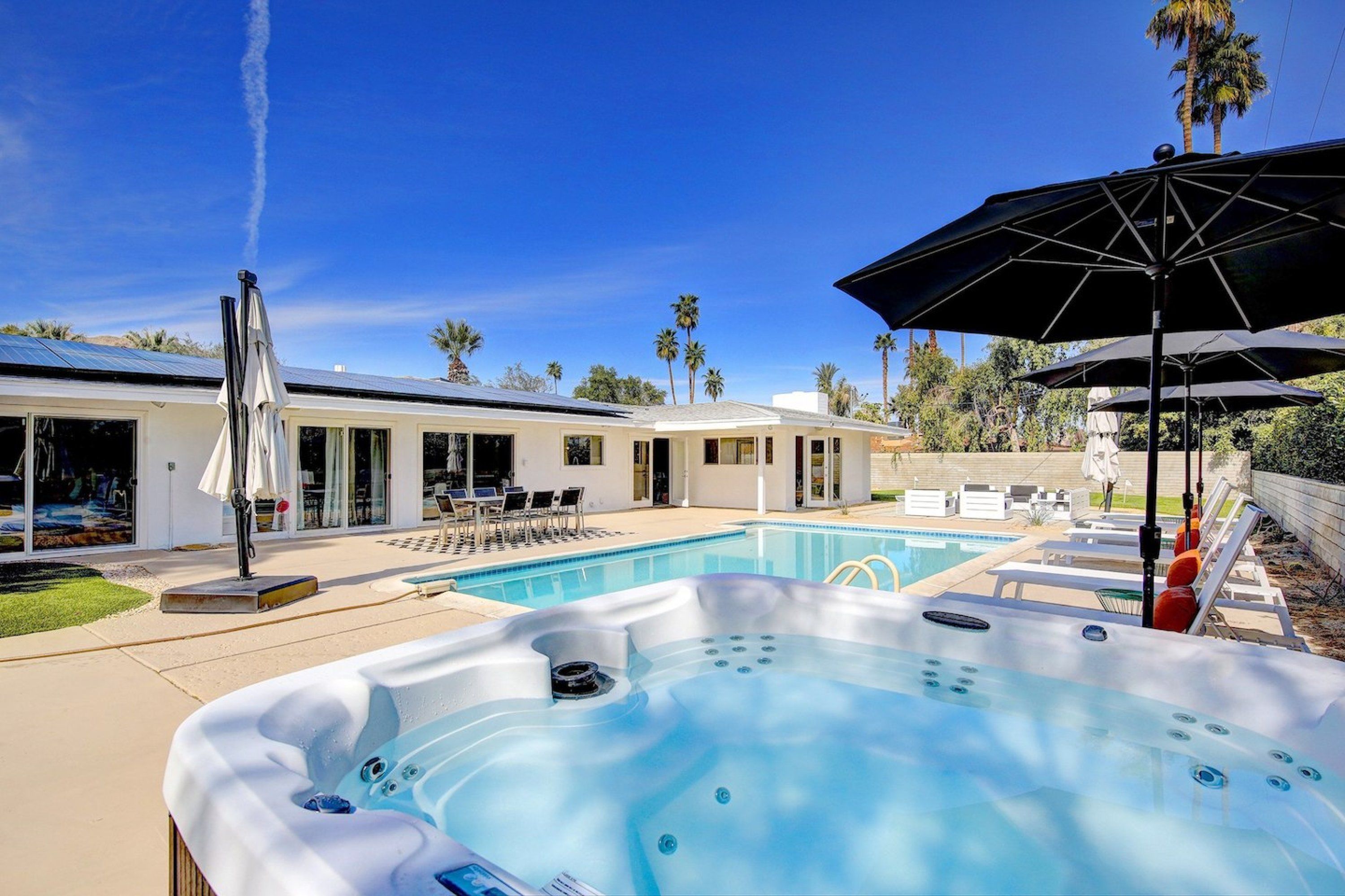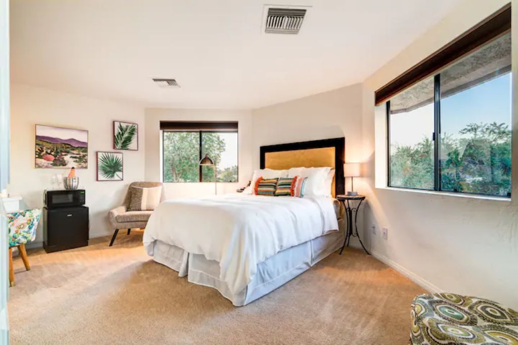 Located in the center of the Coachella Valley we are better than a four-star hotel room with off-street parking 10 feet from the entry. Private entry and private bath. Newly remodeled modern guestroom with private outdoor (patio) sitting area. Separate control mini-split AC/heat for your comfort. YouTubeTV, ceiling fan, LV Floors and large walk-in shower.