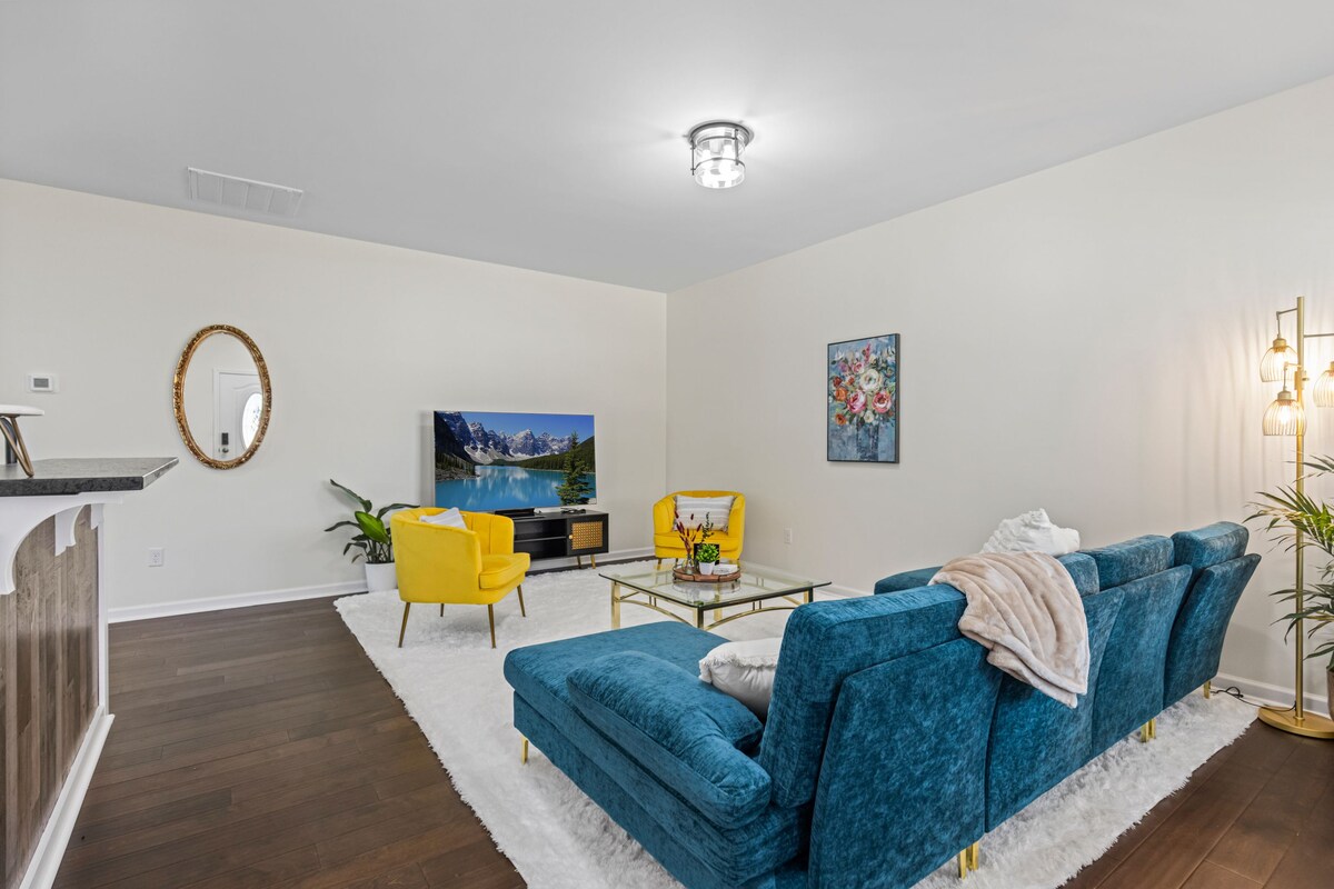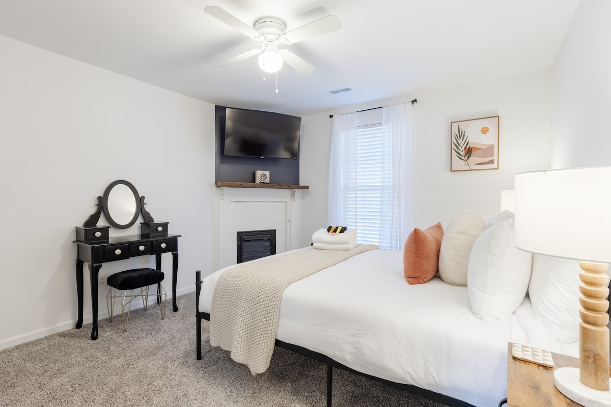 - Primary bedroom has a king-size bed, Smart TV, dual reading lights, wireless charging stations on the nightstands, and a ceiling fan.