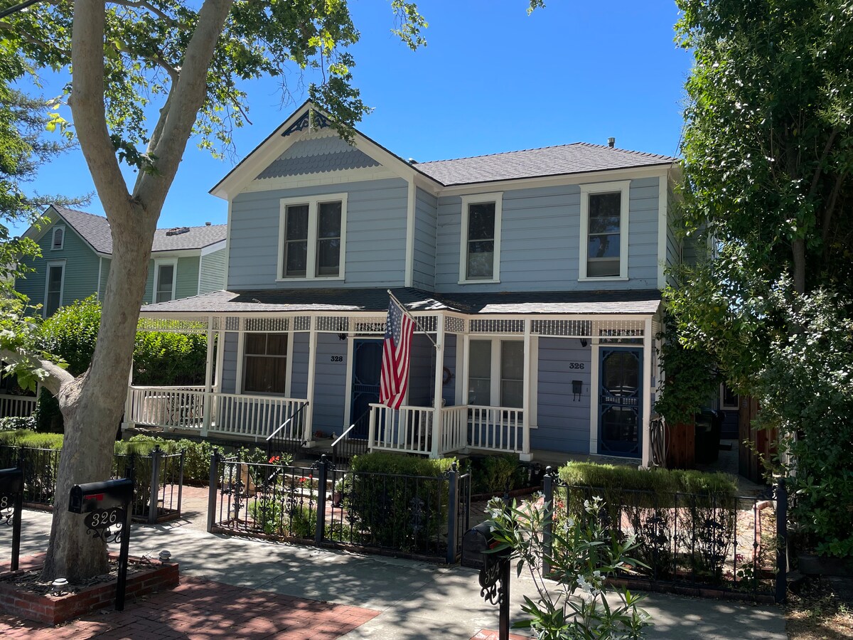 This upstairs apartment has a separate entrance and is fully equipped for your stay. It has one bedroom, one bath, a dining room, living room (sofa bed) and an office nook. WIFI service is included. There is a nice kitchen area with a gas range/oven, microwave and toaster. We have supplied it with extra bedding and cooking needs for extended stays. Beautiful and comfortable in an exquisite downtown location.