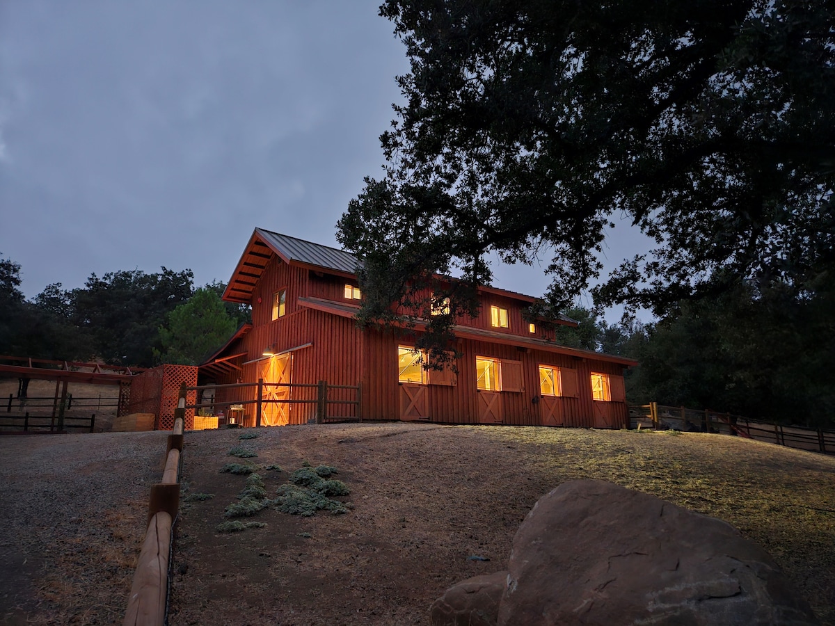 Casa de Granero is a spacious modern, apartment located on the top floor of the Questa Farms barn. Overlooking pastures and oaks, the entry balcony provides an intimate setting for morning coffee, evening cocktails or star gazing. The fully equipped kitchen has service for six, features stunning quartzite countertops with ample prep area, farmhouse sink and standard refrigerator. It opens to the light and bright country pine dining area with adjacent work space and picture window framing the nearby hills. The open living room is comfortably furnished with a large convertible sofa, television and two recliners. The main bedroom and entry bedroom feature queen size beds, televisions and quality linens. When the convertible chest bed in the large entry room is closed, the space functions as a game/work/exercise area. The spacious bathroom centers around a large rainfall shower, two person tub and reclaimed barnwood vanity. Large windows throughout the unit provide plenty of light and magnificent views of the countryside. Air conditioning and heating are available when needed. Guests have exclusive use of an enclosed patio with barbeque (gas or charcoal), fire pit, lounger, table and chairs and an Alaskan cedar soaking tub. Hiking, biking and offroad trails are nearby as are the historic towns of Santa Ysabel, Julian, Wynola, Ramona and Warner and Borrego Springs.
