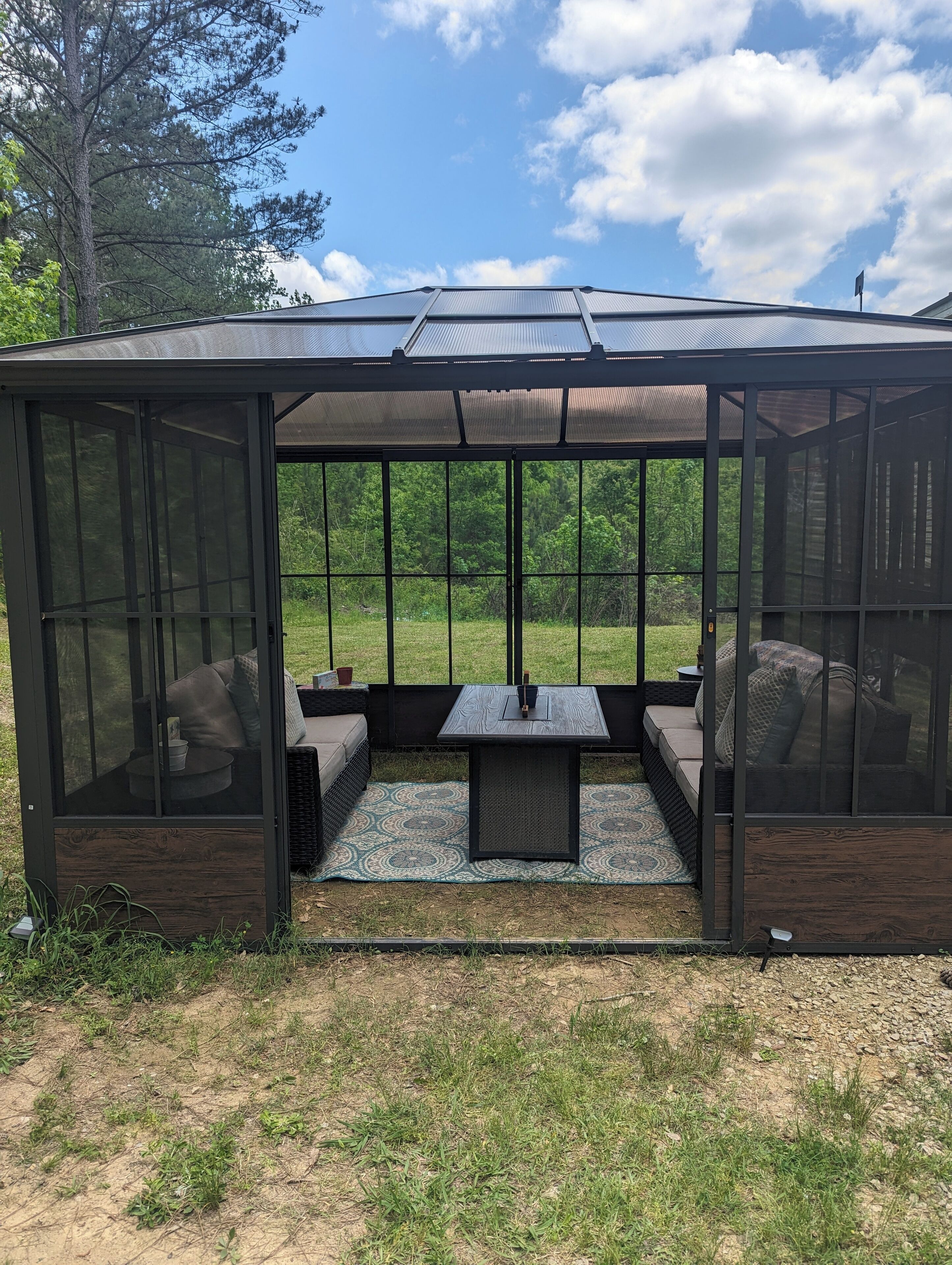 Relax with the whole family in the cozy mobile home. One bedroom with a queen size bed, with all the linens and a 50 inch TV. The other bedroom has a twin over a full over a queen bunk bed and a pull out couch bed, with all the linens, led lights for a fun vibe and a 43 inch TV. The living room is equipped with a large L shaped couch that also pulls out to a bed and a 55inch TV. The restroom provides towels, soaps, shampoos and conditioner. The kitchen has all essentials from cooking utensils to a Keurig, also a waffle maker, mixer, toaster and a few other small appliances. Out side there is a screened in room with a fire pit and two sofas to relax with the woods. You are far enough away to enjoy the quite and tranquility of a small river but close enough to get to Walmart in about 8 minutes. Come have fun at our peaceful property.