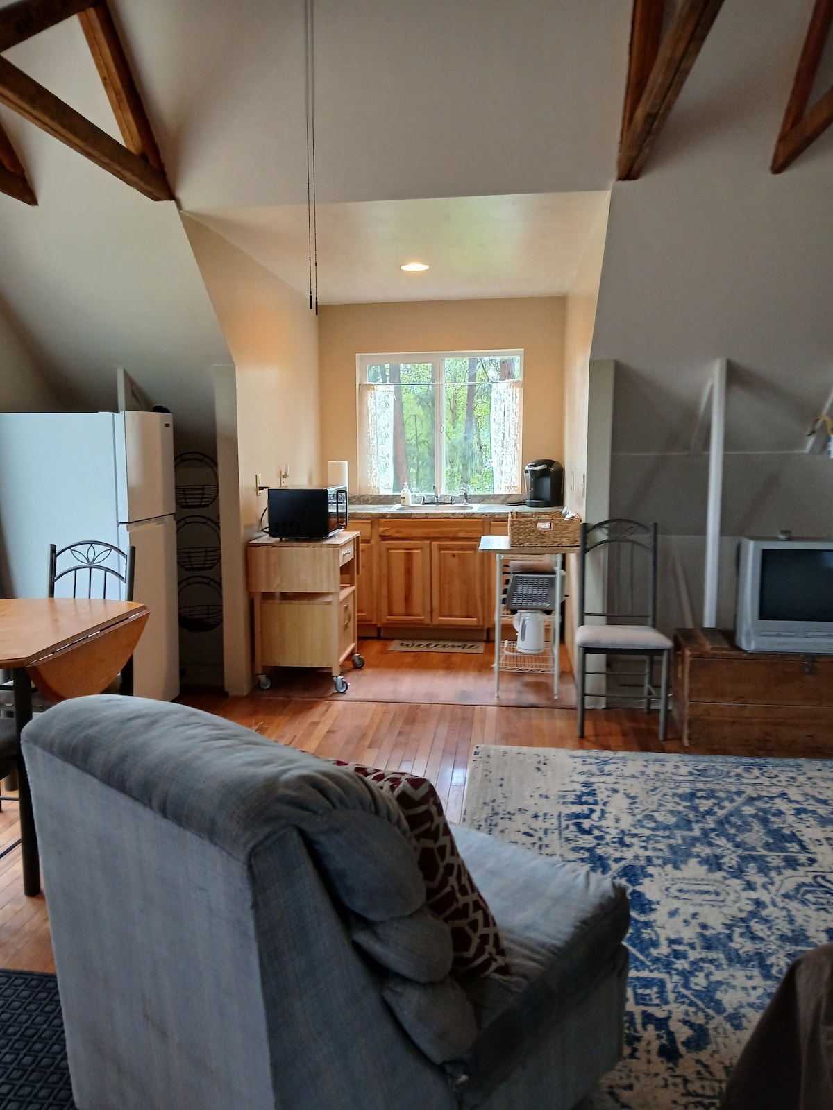 The entire downstairs is a comfortable queen bedroom suite with Pottery Barn furniture, cozy linens and a beautiful duvet. There is also a sitting area that can double as another bed! Full bath adjoins this space. This suite is accessed by a spiral staircase from above and also has an outside entrance. The patio overlooking the river has a hot tub with river views.