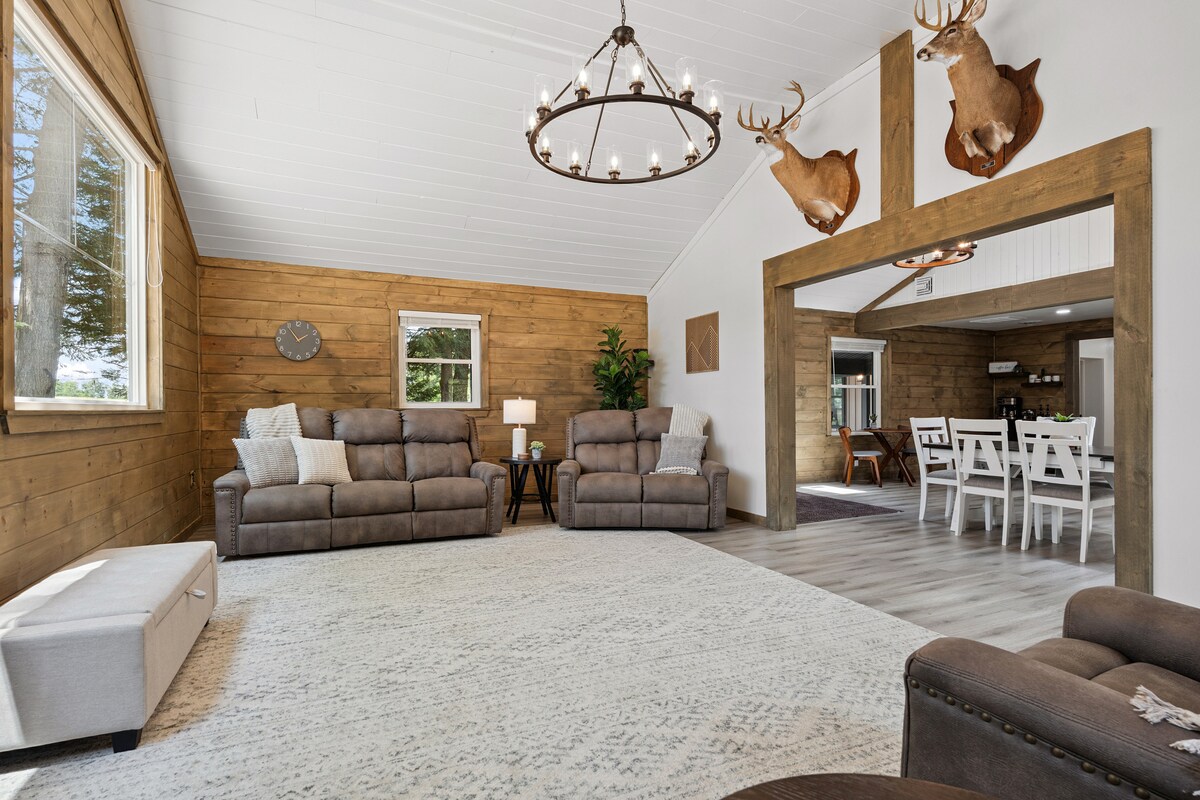 Inside, you’ll find space to spread out and unwind. The large living room features a plush couch, loveseat, and recliner—perfect for movie nights, afternoon naps, or swapping stories after a day in the woods. A full kitchen awaits with all the essentials plus a coffee bar to fuel your mornings.