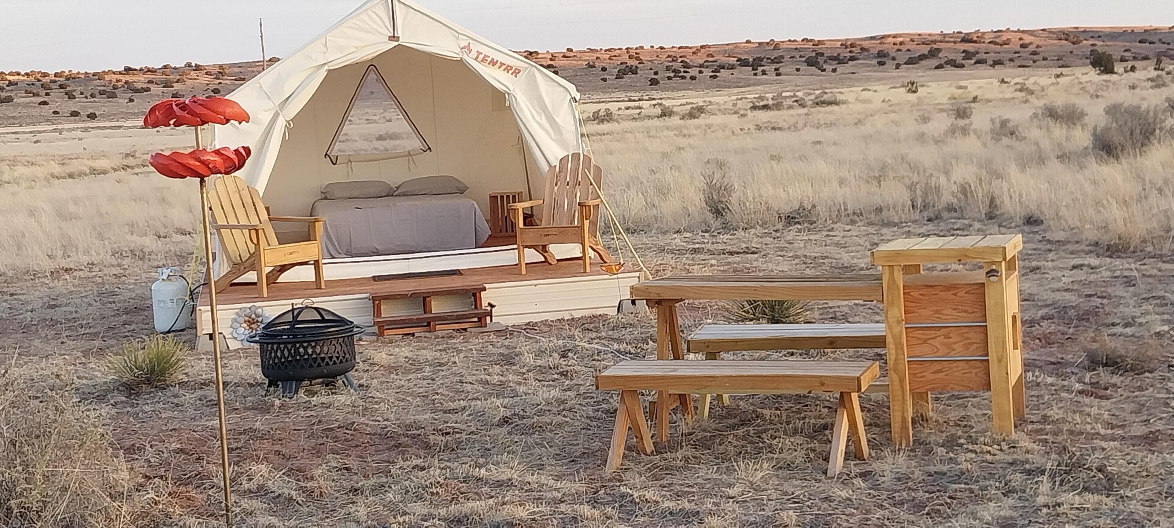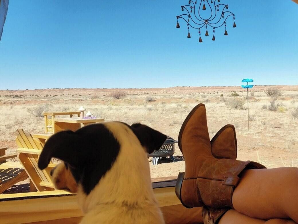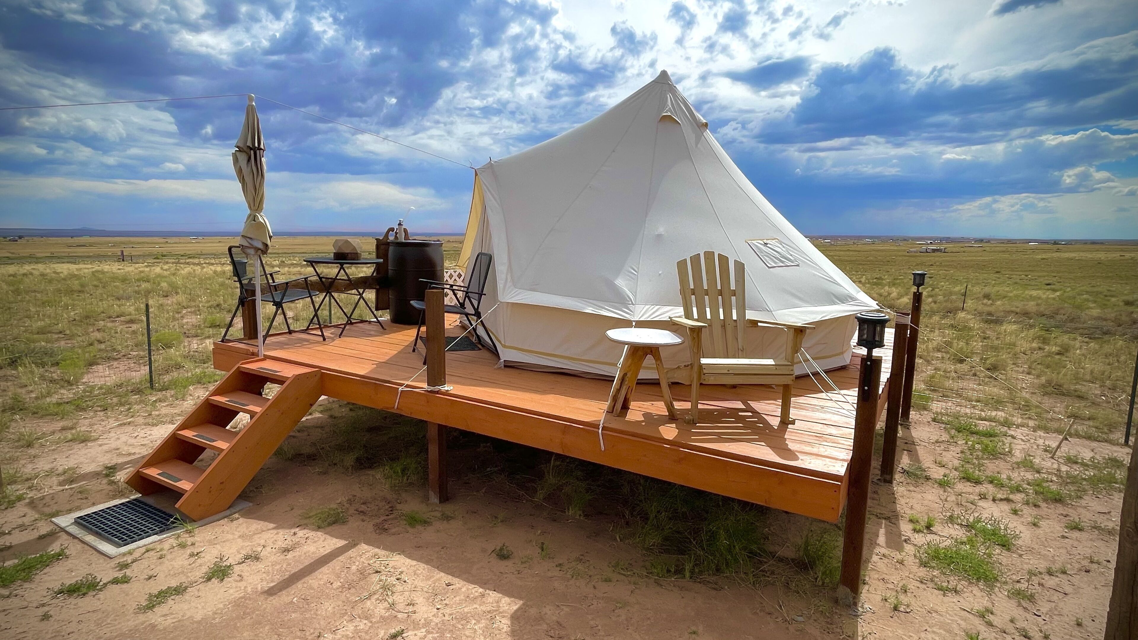 Welcome to your second home. Only 15 minutes from the Petrified National Forest. Enjoy the breathtaking scenery of the large open sky. Onsite you'll have an attentive camp keeper to address all of your needs. Serenity will have you wanting more and never wanting to leave. Arizona has some of the darkest skies on the planet. Bask under the dazzling star lit sky. Plan your visit around celestial events. Inside your home away from home you'll find a comfortable queen size bed. 5 gallons of fresh water with dispenser. A propane heater. Fairy lights to illuminate the indoors. And of course a convient loo.