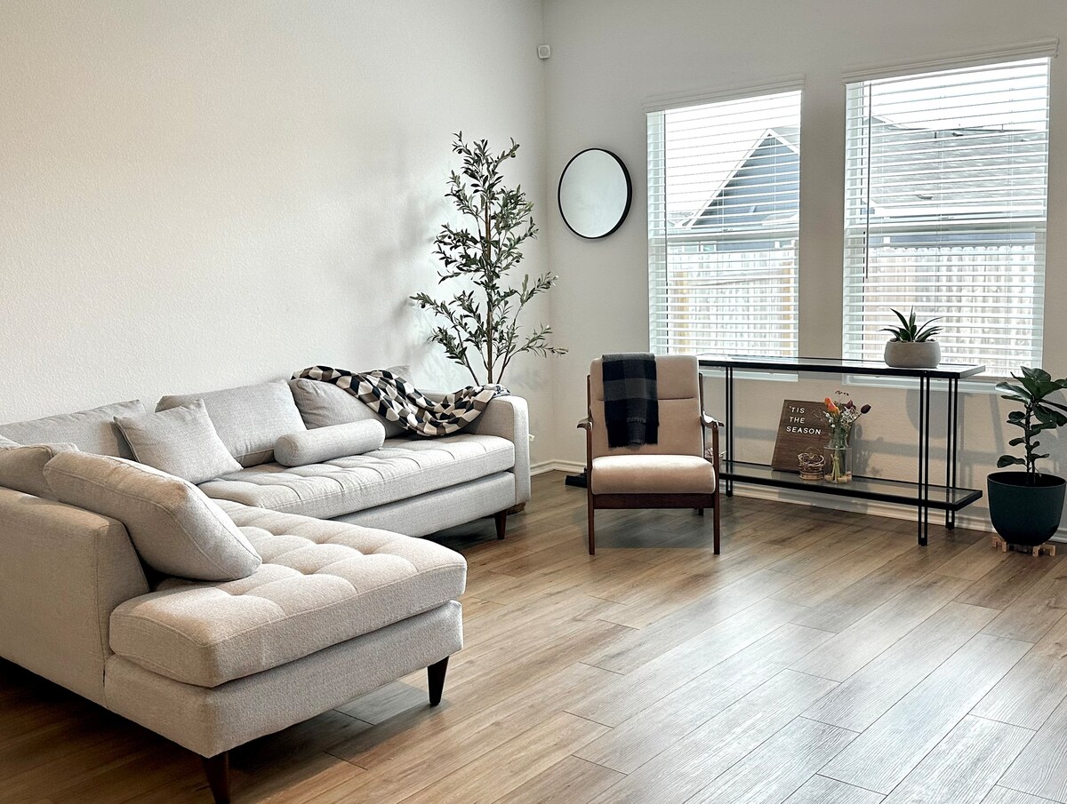 Enjoy a relaxing stay at this modern home located on the outskirts of Austin. Perfect for couples or families who want to get away from the noise of the city. The house is located 12 minutes away from shopping venues and supermarkets. It has a fully equipped kitchen and spacious front patio. High speed Wi-Fi, hot water and 65 "Qled Tv.