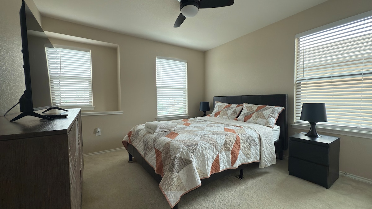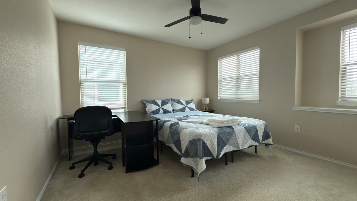 Comfortable upstairs room with a queen bed, work desk, desk lamp, and rolling chair—ideal for remote workers or solo travelers. The bathroom is shared with two other guests. Enjoy the game room with a 75" TV, shared living room with an 85" TV, fast WiFi, Netflix, modern kitchen, free washer/dryer.