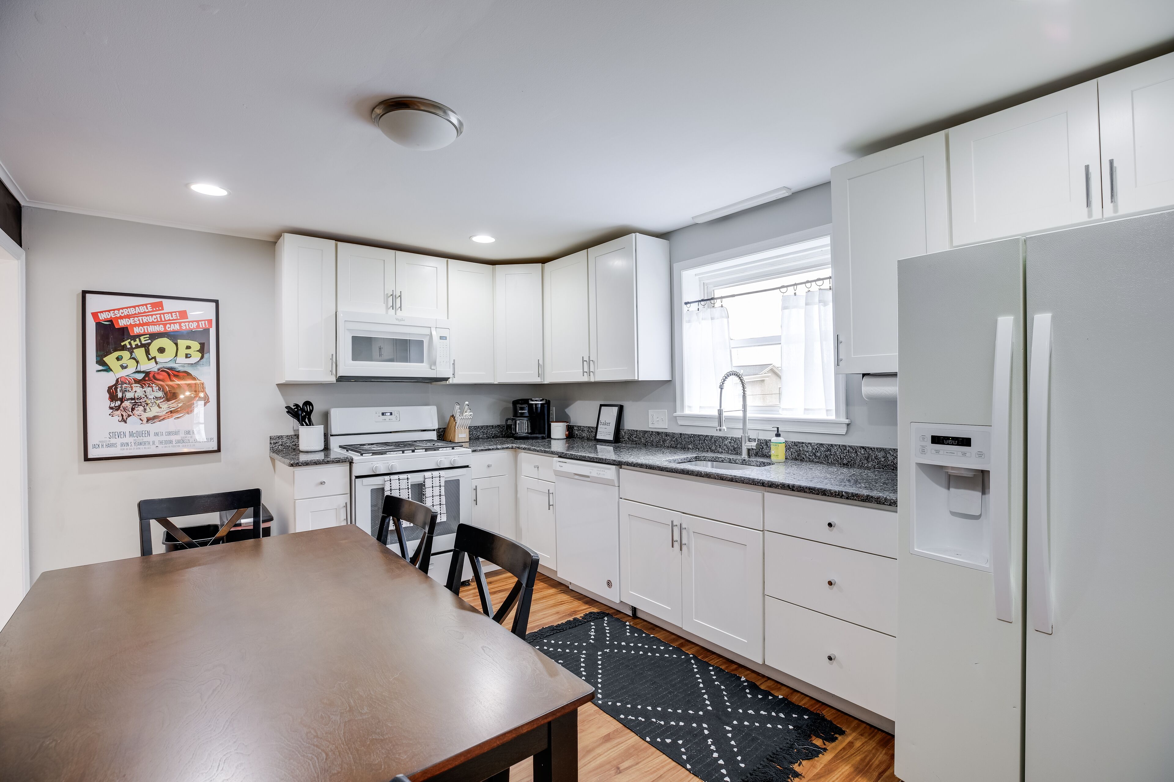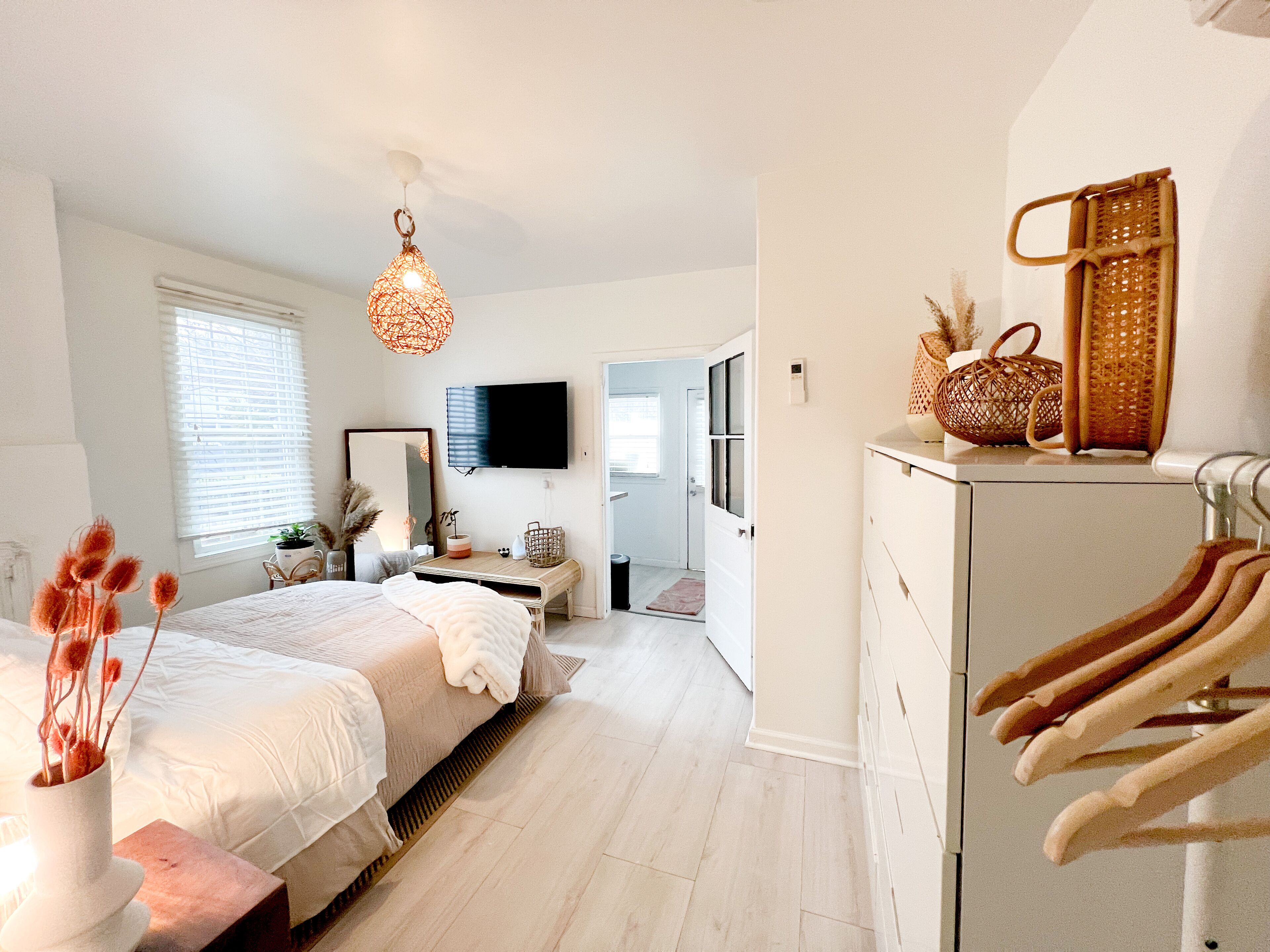 Step into comfort and warmth from the moment you check in. Our recently renovated space invites you to relax and unwind in a serene, cozy atmosphere. The modern kitchen, with its crisp white cabinetry, elegant quartz countertops, and natural wood shelves, is fully stocked with all the essentials. Whether you're preparing a meal or enjoying a cup of coffee, you'll find everything you need—pots, pans, an instant-pot, a hand blender, pizza cutter, coffee maker, tea kettle, toaster, coffee/ tea, sugar, spices, and more. A convenient washer/dryer closet and powder room complete this welcoming space.