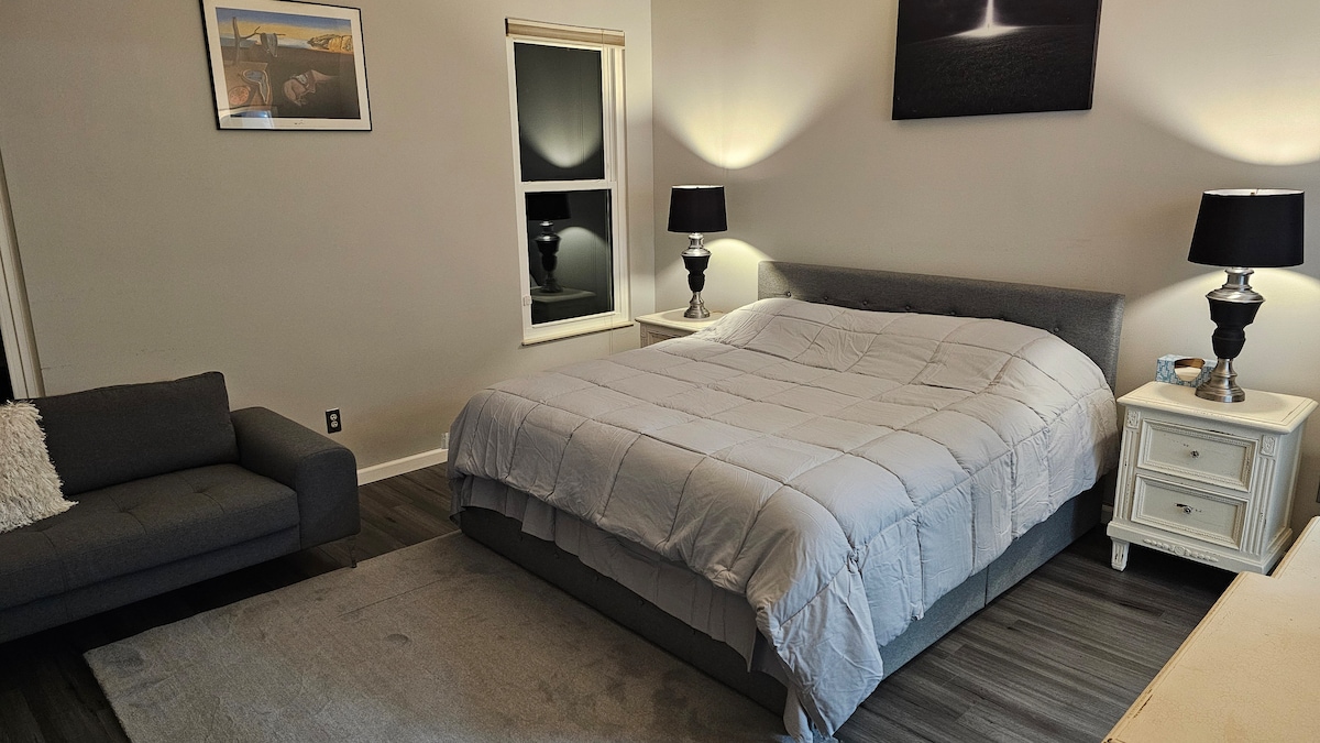 This private bedroom with workspace and newly remodeled full bathroom is modern and sexy for all genders.