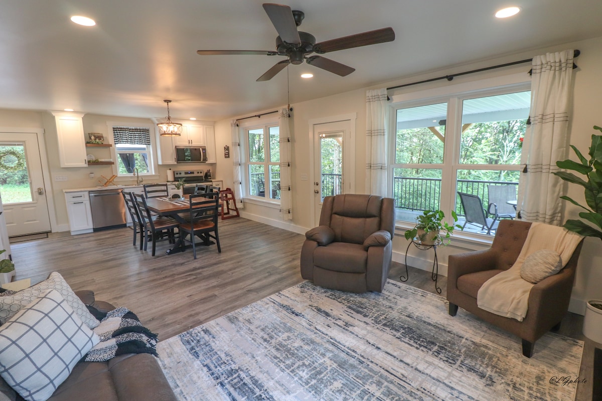TINY HOME FEATURES: Mountain views, hot tub, gas grill, picnic area, 2-seat table, outdoor bistro table, rocking chairs, ceiling fans, ample lighting.