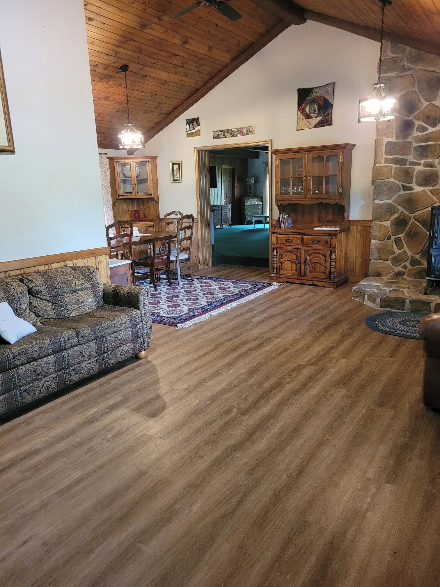 INDOOR LIVING: Smart TV (w/ Netflix, Hulu, Disney+ & ESPN+ connection), wood-burning stove (firewood provided), jetted tub, dining table, coffee nook w/ coffee grinder, drip coffee maker & Keurig, books, cathedral ceilings, ceiling fans