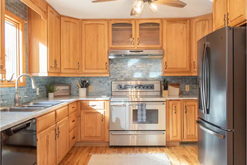 Blue Mountain Bungalow offers a fully equipped kitchen, living room, three bedrooms, one full bathroom, and a laundry room. It is tastefully decorated and sparking clean to ensure that you have a relaxing stay. Two bedrooms have queen beds, one bedroom has single bunk beds, and there is a sleeper sofa in the living room.