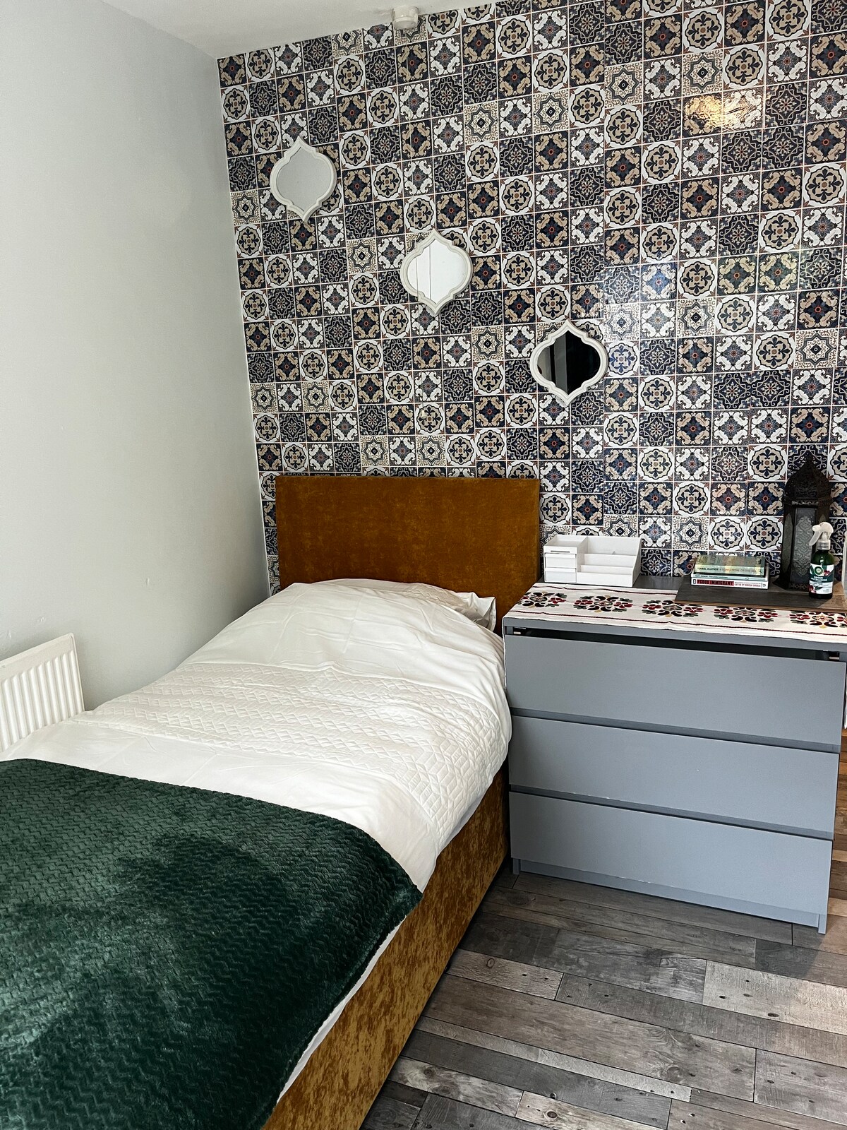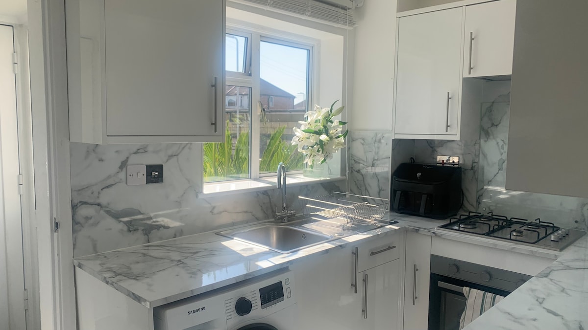 Newly Refurbished room in a house to a high end standard being of high quality porcelain grey tiles. Full size private kitchen with a patio. Free fibre fast internet. Equipped with a fridge, freezer, microwave, Gas cooker, oven, kettle, dishes & silverware, pots & pans. Abundant amount of close transport services such as Hayes & Harlington train station (including Elizabeth Line) only 7 minutes walk to get you into London & Heathrow Airport. Heathrow Airport only 2 miles away.