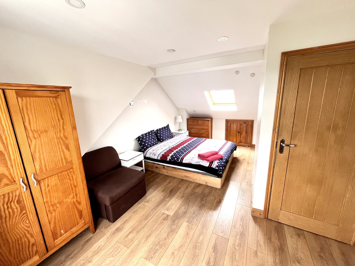 The bedroom has a king size bed, large wardrobe and chest of drawers. The bathroom is brand new with bath and shower. The living room area has a double sofa bed and 55 inch smart TV. The kitchen has a marble dining table with seating for 4 and is fully equipped with gas hob, electric oven, dishwasher, fridge, freezer, microwave, toaster, kettle, cutlery, utensils and pans etc. Free fast WIFI throughout. There is also a washing machine in the hallway in front of the bathroom.