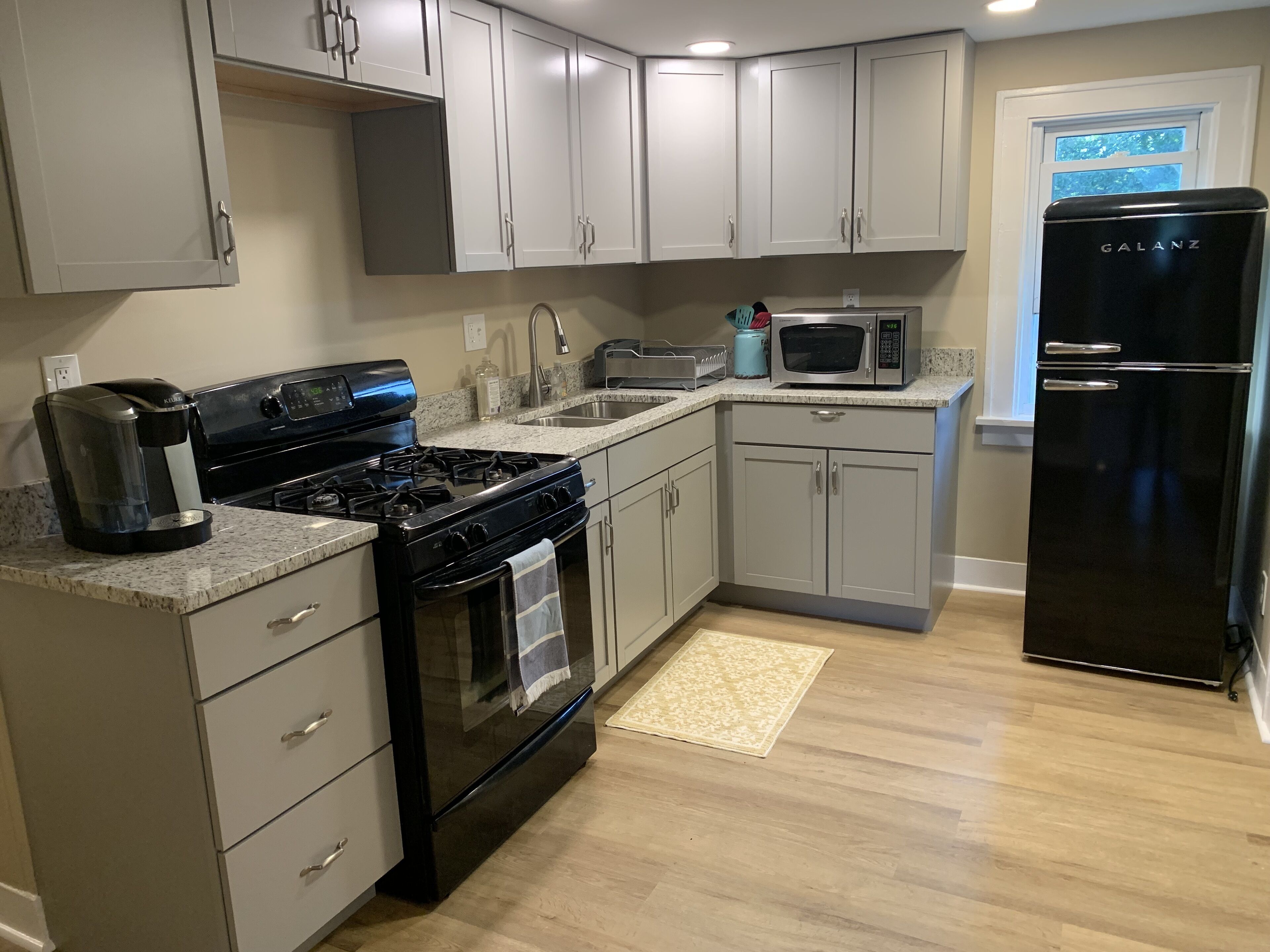 Located in a sleepy suburban neighborhood, this freshly renovated apartment offers everything needed for a weekend getaway, business trip, or extended stay with a full kitchen, open living space, and bedroom.
