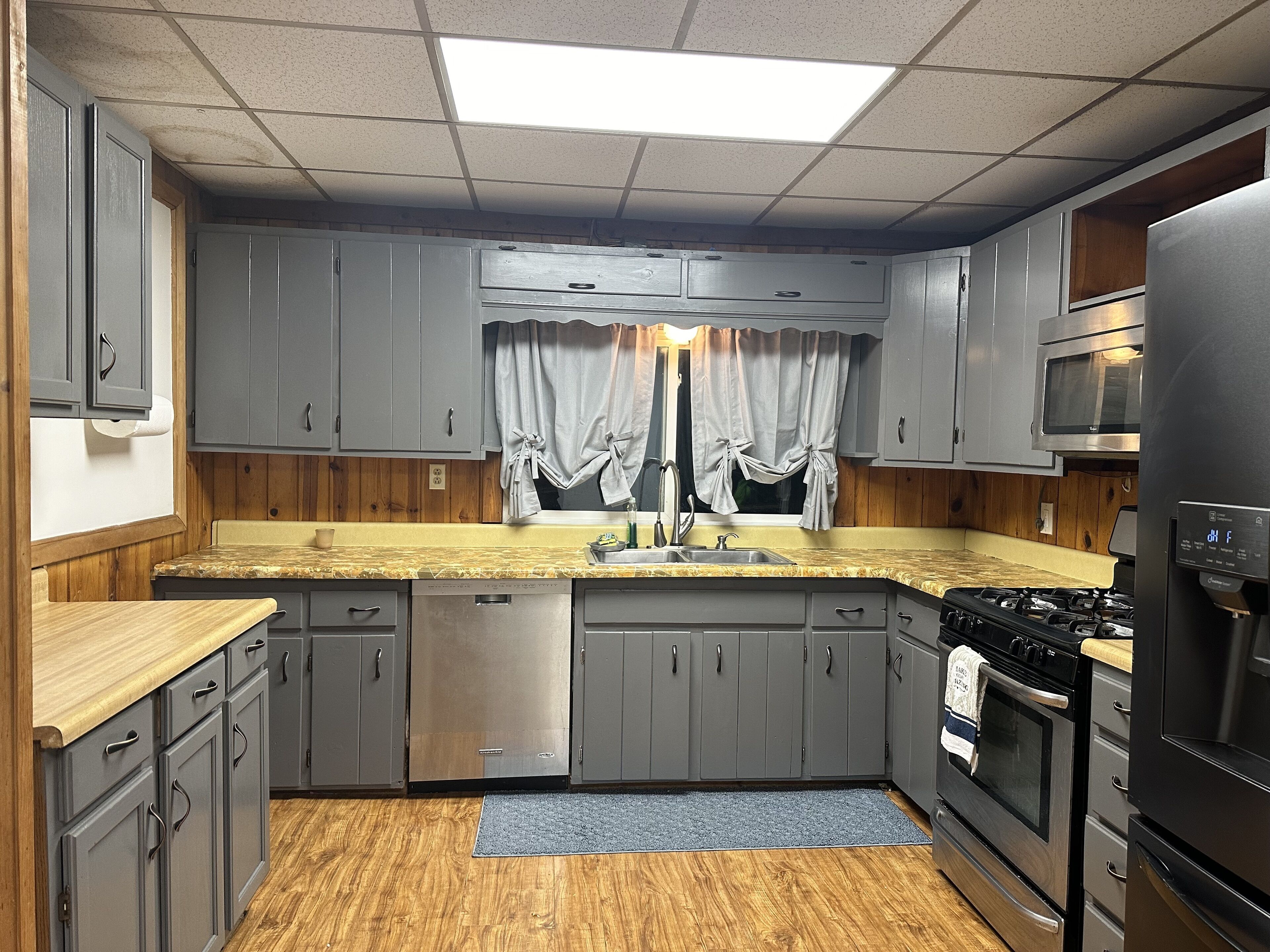 The kitchen features a stainless steel island perfect for cook prep and sit-down meals. The open concept allows your group to gather in the living room TV / kitchen / dining area all together with plenty of space and seating to go around.