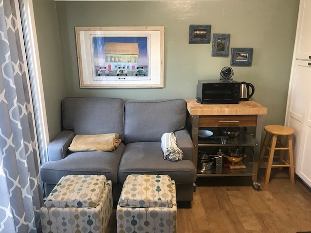 Watch the fog hover over Twin Peaks as you have your morning coffee as the warm sun shines through your windows on three sides of the room. Accommodations include a warm comfortable bed, cable TV and wireless Internet access. You will also find a half-bath with a beautifully tiled shower, wet-bar with large sink and small refrigerator. You will be provided with dishware, pans, and utensils to make simple meals with the microwave, electric burner, and toaster oven. Linen and towels are provided.