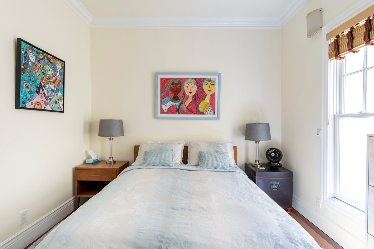 Delightful private large single room with a queen size bed, soft cotton linens, large closet, working desk, beautiful colorful art and small refrigerator. A place to come and relax after a busy, long day. The bathroom is impeccably clean and airy, with a large window overlooking east. The room is located on a third floor in a Victorian house. Free WIFI, keyless door locks for easy check-in and check-out. No kitchen access. Exterior security surveillance cameras.