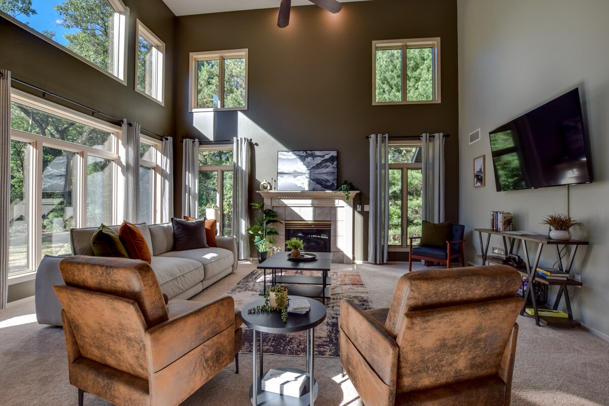 INDOOR LIVING: 2 Smart TVs w/ cable, wet bar (w/ microwave & mini fridge), farmhouse dining table, desk workspace, walk-in showers, large windows, natural lighting, remodeled interior w/ original cedar siding