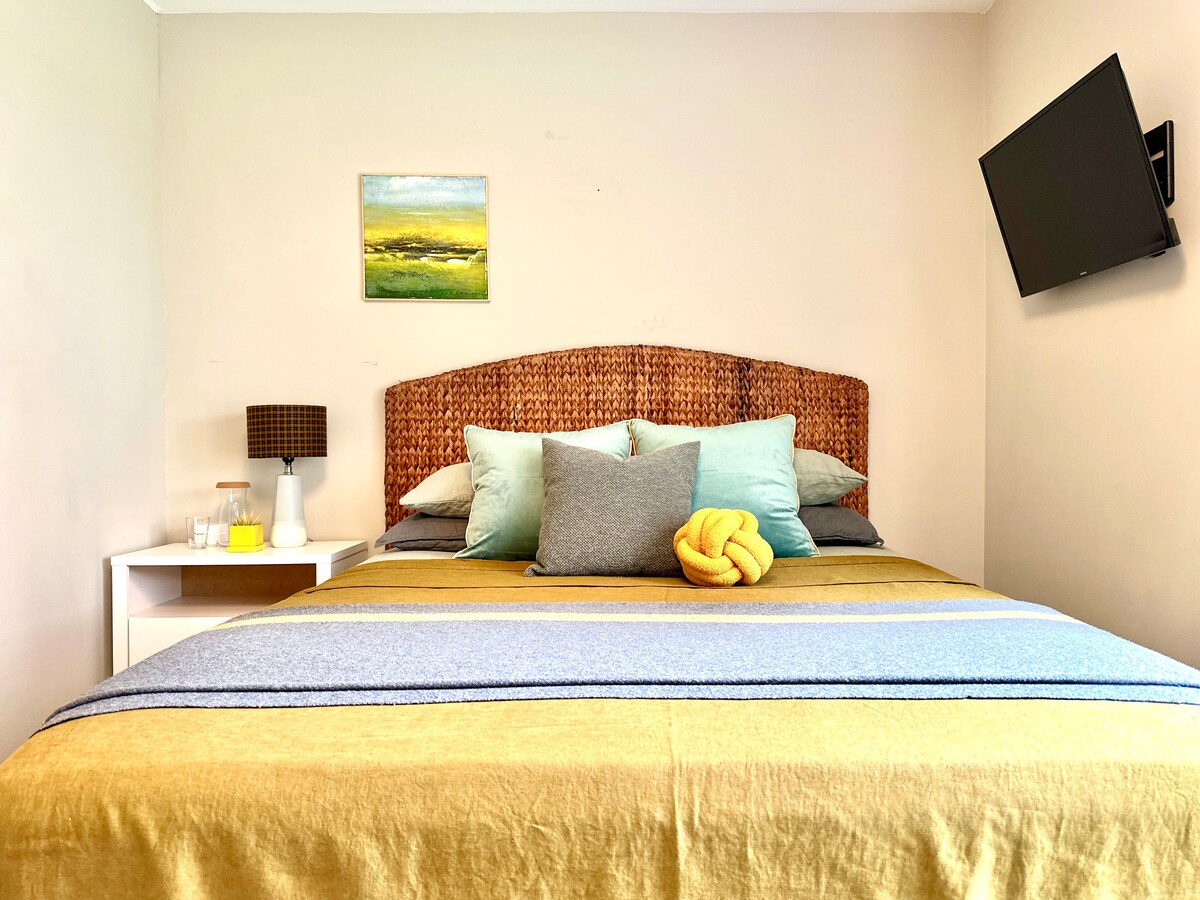 A clean and comfortable room featuring a brand-new queen-size bed with fresh linens. Guests have convenient access to five shared bathrooms, ensuring plenty of space and privacy during your stay. Perfect for relaxing after a long day or enjoying some downtime indoors.