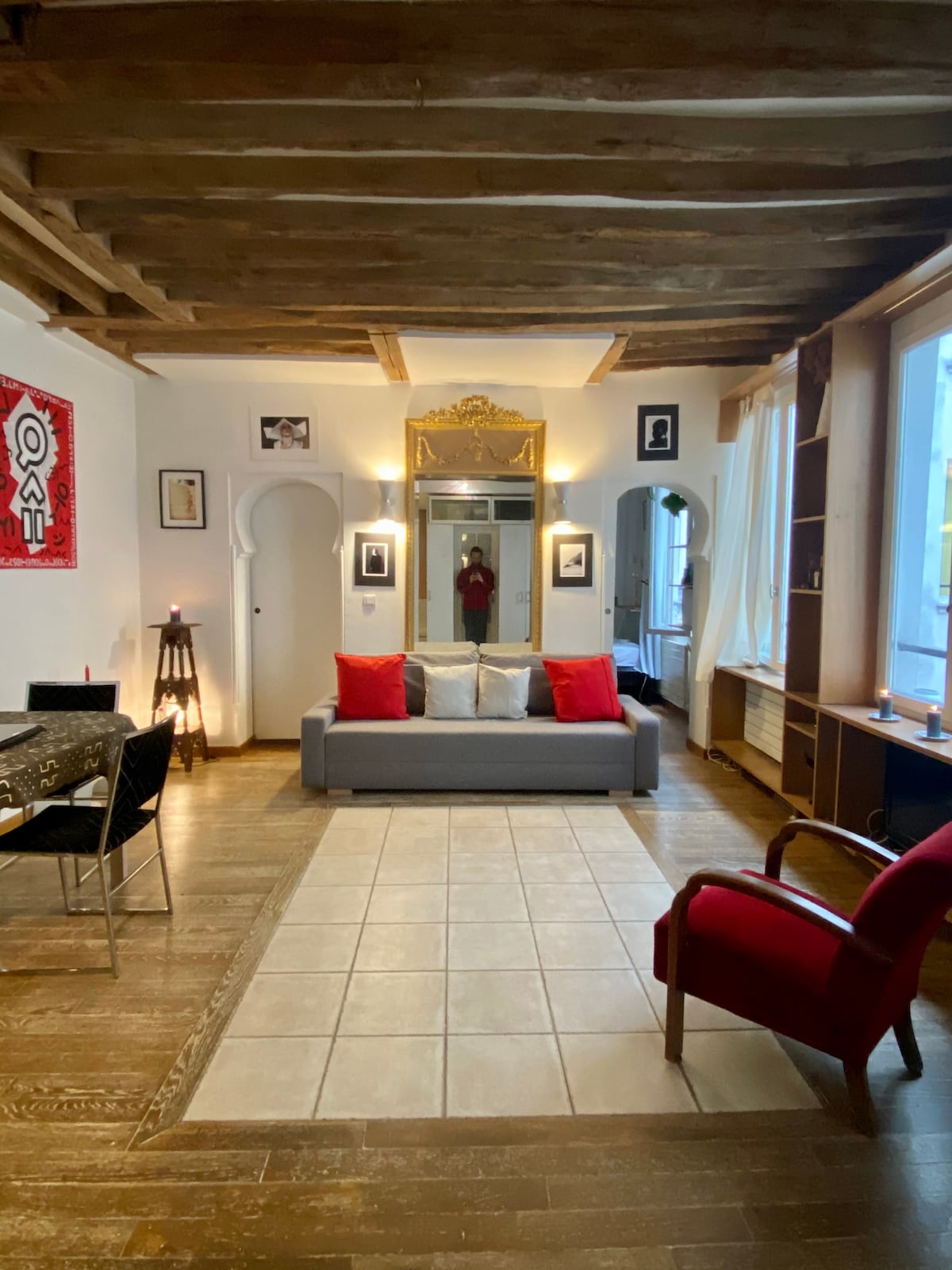 It is an apartment full of hide, with exposed beams, oriental doors, ornate mirrors, well designed.