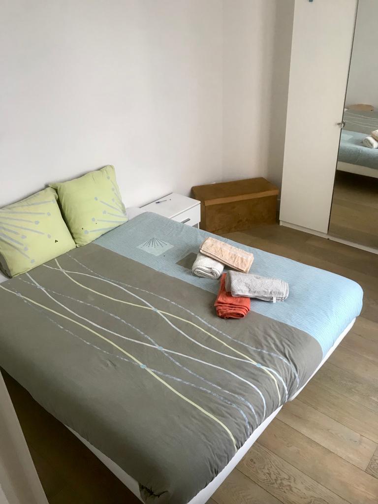 In a very commercial street, with lots of cafes and restaurants, in a central area of Paris, the apartment is quiet, facing south, on a very nice courtyard. The bedroom features a double bed, desk, and closets. It is next to the bathroom, at the end of the hallway, isolated from the rest of the apartment. However, we share the living spaces and we are asked to respect reasonable schedules and the tranquility of the house.