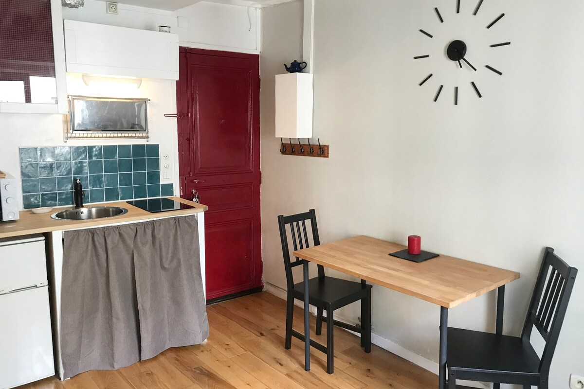 - "The stay was great and very easy to check in and out, great location in a busy neighborhood in Paris. Only one minor complaint/feedback is that the window curtain looking into the courtyard is a bit transparent, especially at night when the room is lit. Just beware of that if privacy is a concern. " - "The spot is fantastic!" - "Great little studio! I loved the easy access to the metro and the fact that there are several taxi companies nearby, It made my travels around Paris so much easier,"