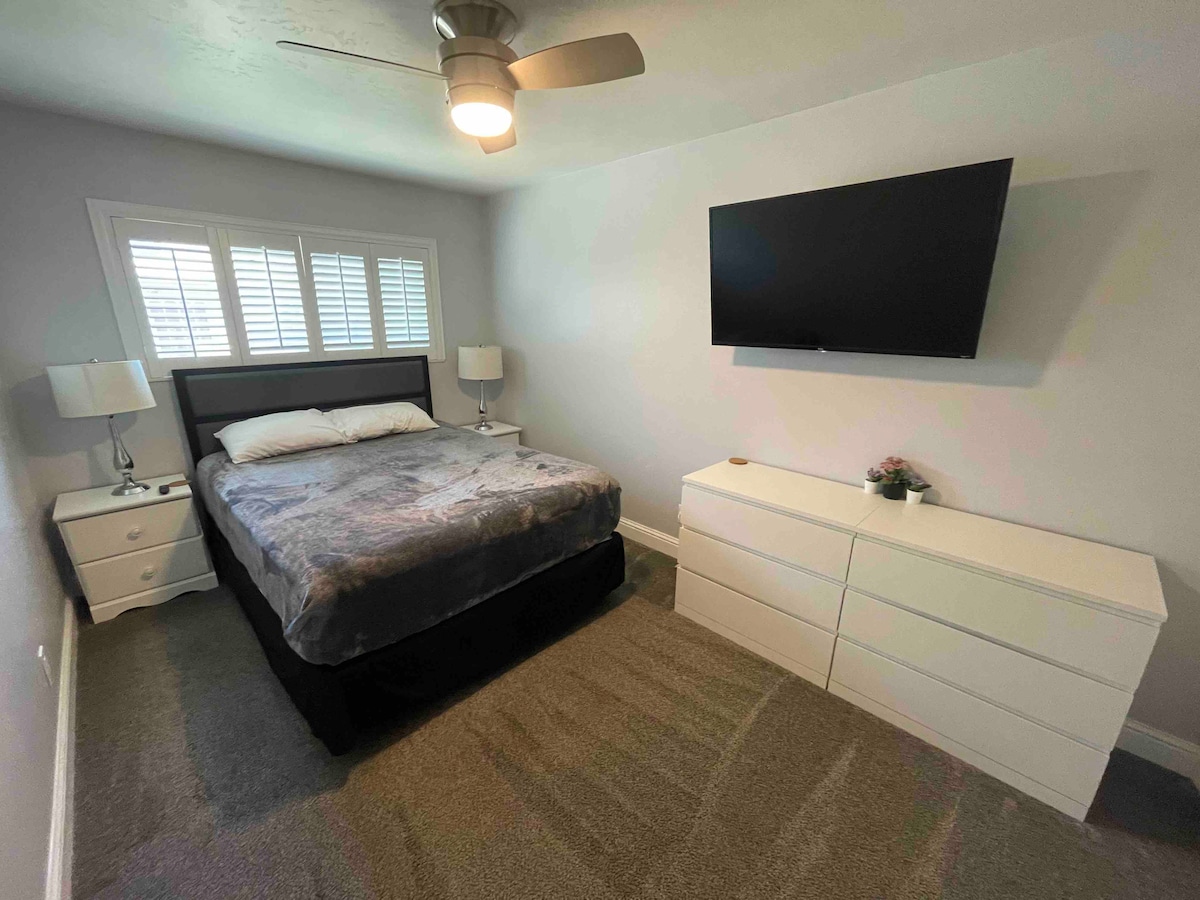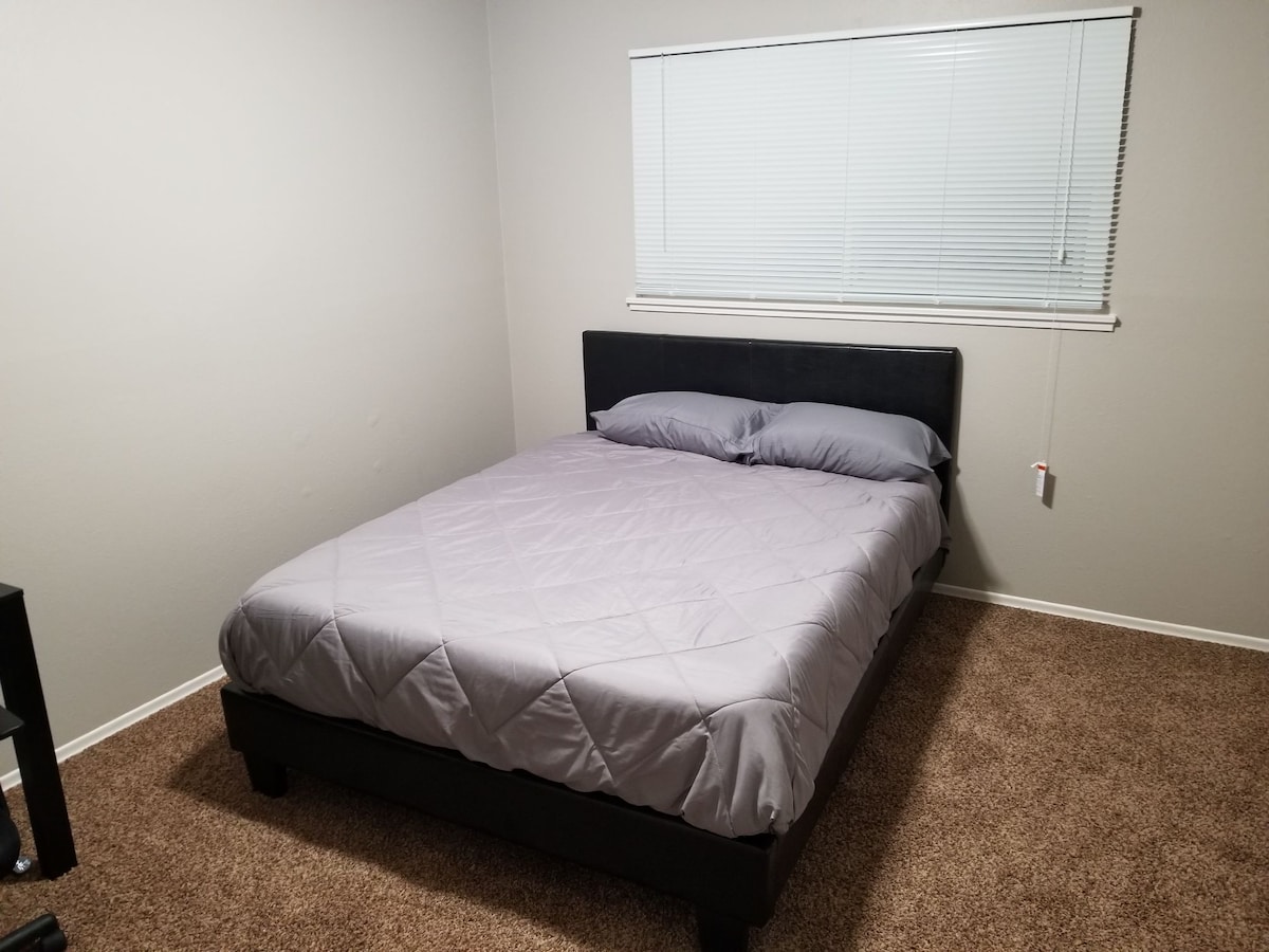 This bedroom offers a double-sized bed, Closet and table lamp. It is situated in a quiet Clovis neighborhood with easy access to the freeway. Close to Fresno airport and shopping complex and Yosemite park.