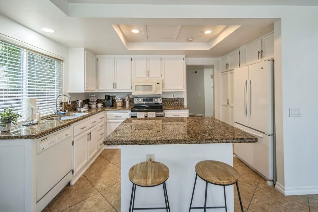 The fully equipped kitchen is a culinary dream, complete with stainless steel appliances, quartz countertops, and all the essentials needed to prepare meals at home.