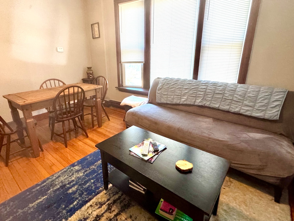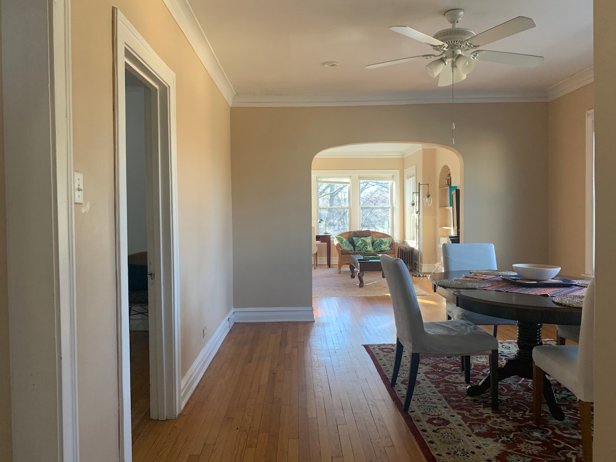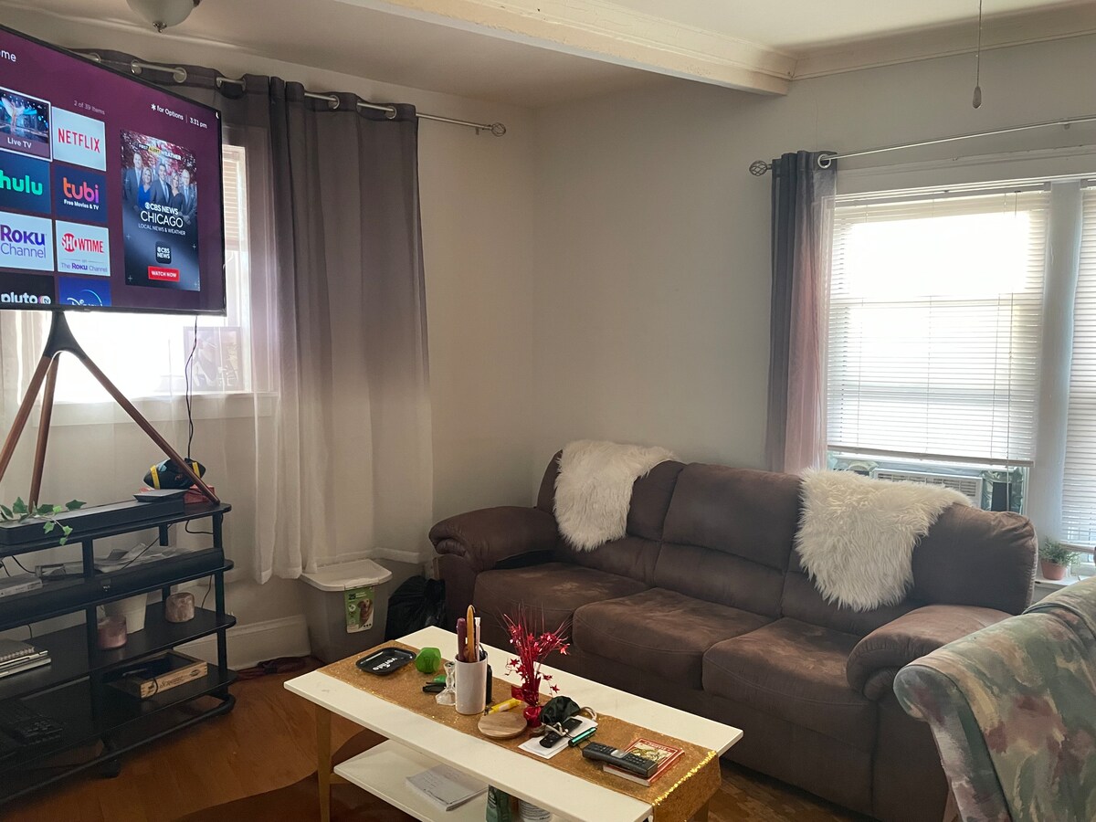 Forget your worries in this spacious and serene space. Top treetop views on the top second floor. Very spacious and large 1 bedroom with lots of windows and sunlight throughout. This is the second floor and top floor of a 4 unit building. The apartment has a partial angle view of the beautiful River park. Lots of summer activities in the park by the trails and the Chicago river in the park. Easy street parking in quiet tree lined streets.