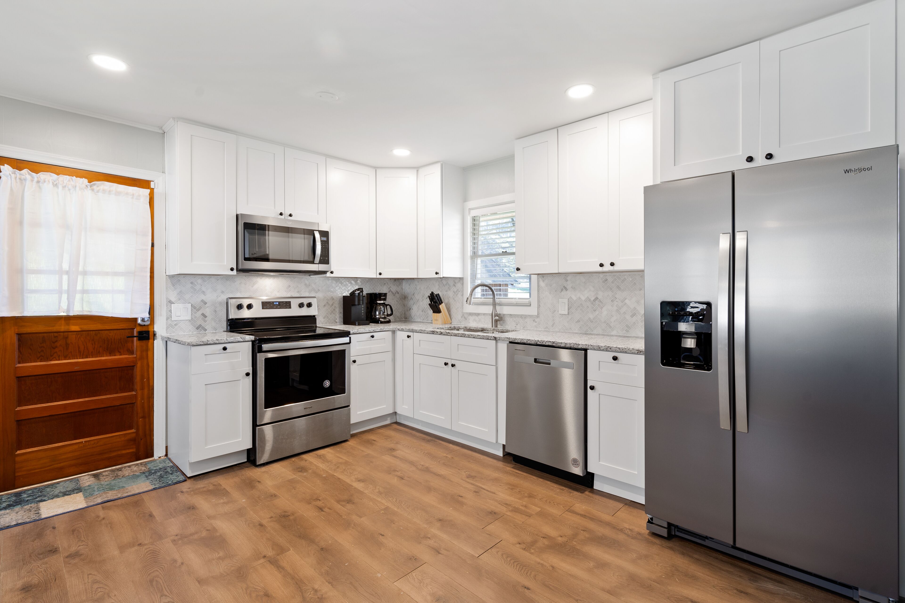 The kitchen has been fully remodeled with granite counter tops and alll stainless steel appliances! It has a small dining room with a table that seats 4 and a bar that seats 2 more. However, there is also a table out on the covered deck overlooking the lake that can seat 4-8. It has 4 chairs and 4 stools, if you will—so can seat up to 8 if needed. Many families choose to divide up with 4 in dining room off from kitchen and 4 out on the deck..or set it up kids and adults tables! It is a very good set up for a family or even a couple of families! Because it is out in the woods and on the lake front row—please do not leave food out on counter tops as this invites ants to come in then for food…and please do be aware since in the woods—there may be an occasional spider or web no matter how much it is cleaned and even with our pest control. It is surrounded by trees—when look out from terrace level like being in a tree house as trees all around you and the lake!——speaking of terrace level…