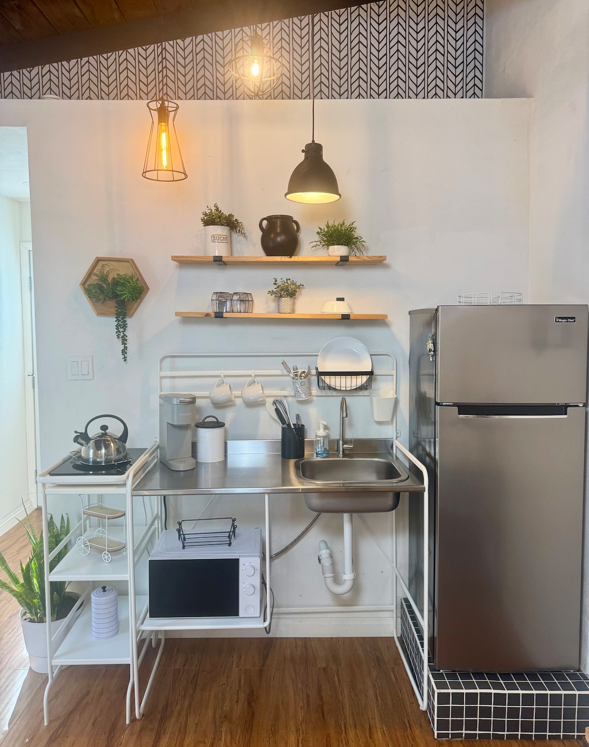 The Living room is equip with a large 55” Samsung Frame smart TV and a large couch and ottoman, allowing you to kick back for a comfortable night with all of your streaming services. There is a record player stocked with a few of our favorite records for you to enjoy. The fully stocked kitchen is open to the living room and flows beautifully. There is an electric stove and oven, a refrigerator with a water and ice dispenser, microwave, dishwasher, farmhouse sink with a garbage disposal and a large pantry space. All appliances are modern and new.