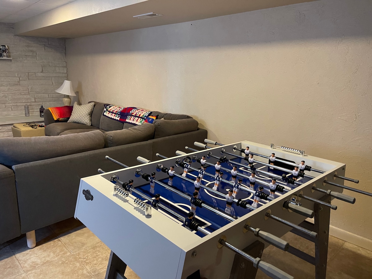 The basement is 60% finished with a large game room and theater system. This space can also accommodate additional guests ($25.00 additional per guest over 6) with air mattresses and/or cots. The house is equipped with 1 queen and 1 twin air mattress.