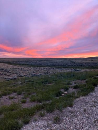 The Bunkhouse has a large deck that spans the entire length, so you can enjoy the stunning views of the Wind River and Owl Creek Mountain Ranges! If you need room to roam - enjoy endless space to take a walk or jog. Plenty of space to park. Campfire rings and firewood are available. Occasionally, we have campers stay - but they park pretty far from the Bunkhouse and they are almost always very quiet. Most of our campers come in the late afternoon and leave early in the morning.