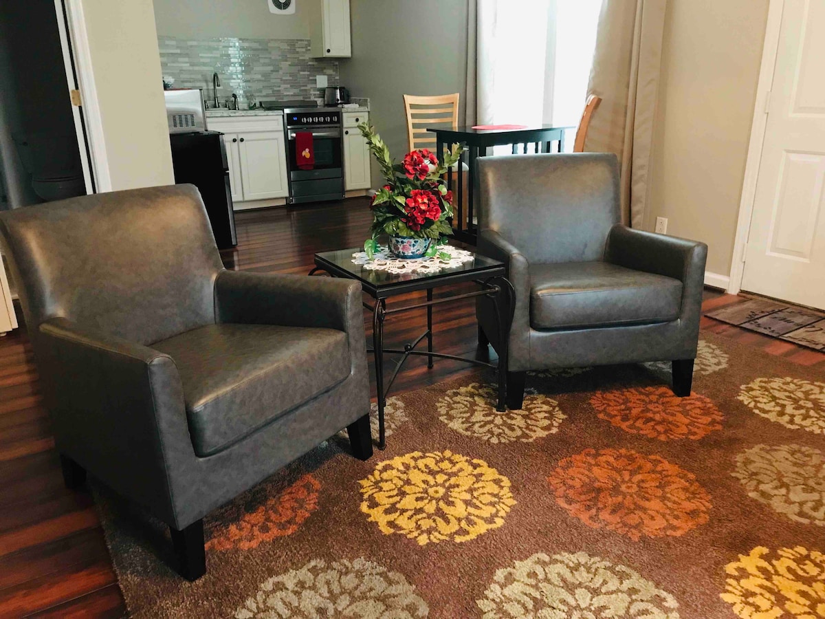 Our Hangar apartment, completely renovated, is fully furnished with living room space, WiFi TV, and kitchen area with dining table. The bedroom is beautifully appointed with a new queen bed and BeautyRest Black Luxury mattress. The adjustable base offers features such as dual massage, head tilt, Zero-G preset, light therapy and sound therapy to make for a comfortable rest while away from home.
