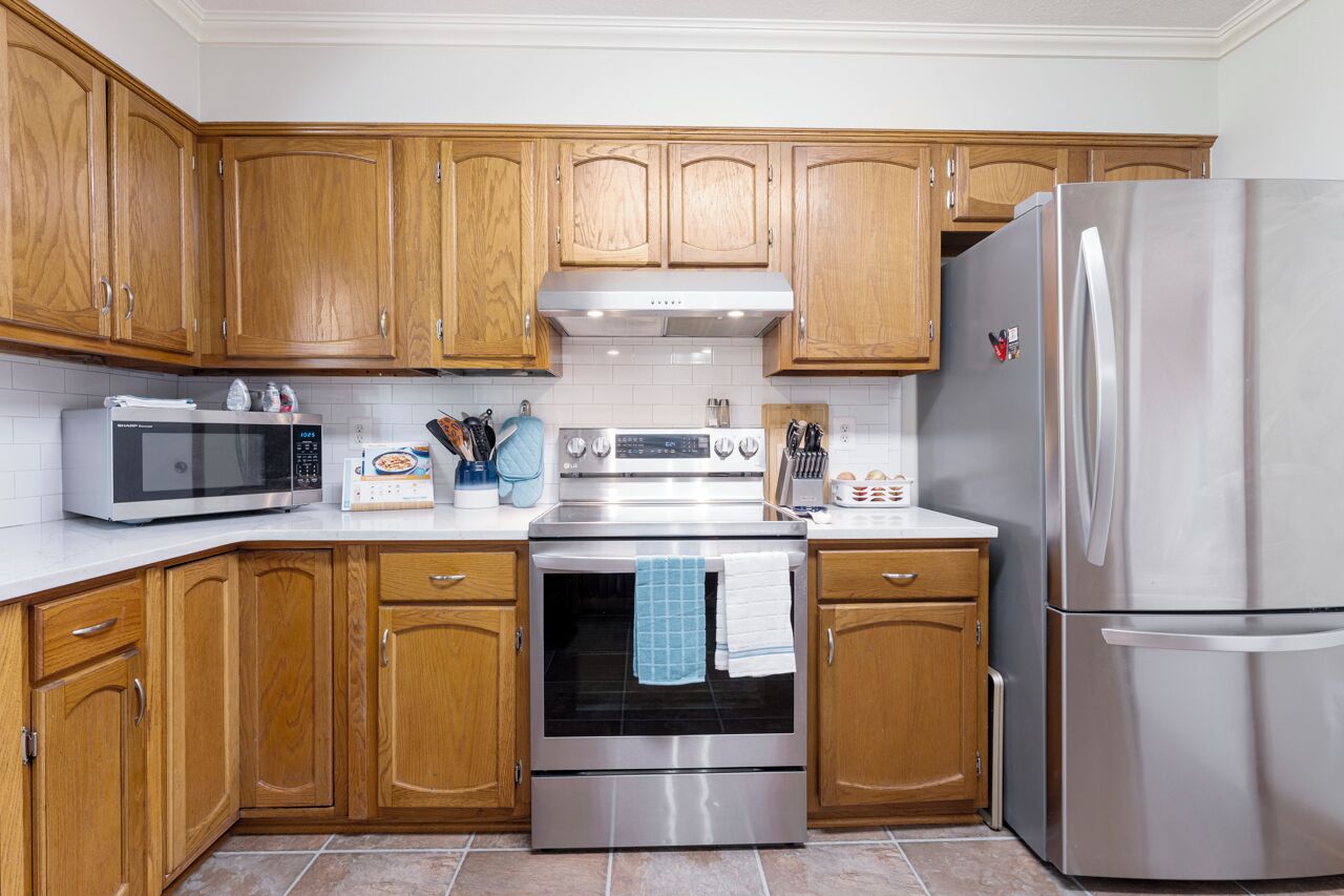 The kitchen is open to this area -- so you can cook, enjoy your guests AND the view at the same time. There are 4 comfortable bar stools, so you can enjoy breakfast, snacks, beverages, or just good conversation with the cook! This well-equipped kitchen features a refrigerator, microwave, air fryer and plenty of counter space to work with. You’ll find all the necessities such as a dishwasher, toaster, microwave, icemaker, blender, ample plates, glasses, and kitchen utensils. You'll also find one coffee maker and wine cooler on the other side.