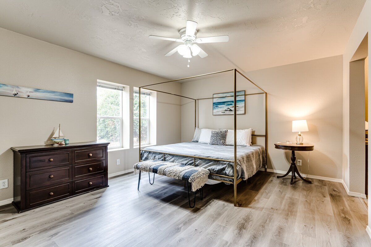 There are 3 private bedrooms and a loft area with a combined 6 beds total. The master, second bedroom, and both bathrooms are located on the first floor. A custom sliding barn door divides the first floor from the upstairs. Upstairs features another cozy master bedroom with queen bed where you can sleep beneath the eaves. The rest of the second story is a spacious open loft area with one full bed, two twins, and a desk area. There are three A/C units throughout the house. Each bedroom is also equipped with a DYSON air purifier/fan for your comfort!