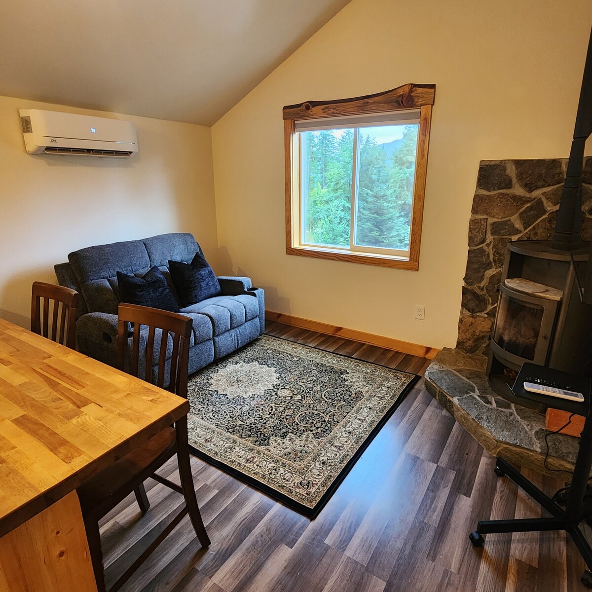A wood stove and two mini-split units provide heating and cooling. Wood is not provided.