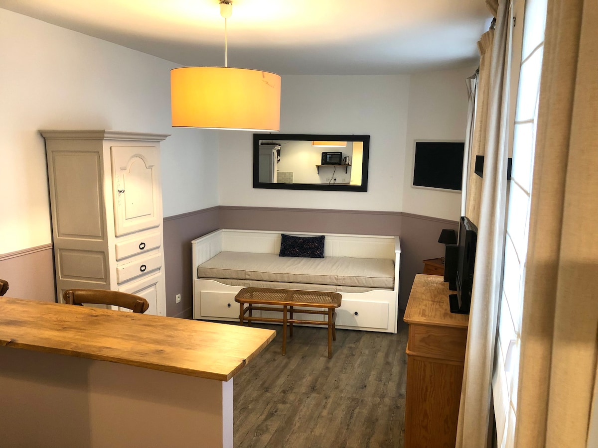 Located on the ground floor of a quiet and secure building, enjoy a pleasant stay in this charming, chic and modern studio for 2 people in Paris.Very practical, it has a double bed, a lounge area with a television and an open kitchen equipped with an oven, a hob, a kettle, a dining table and storage cupboards.