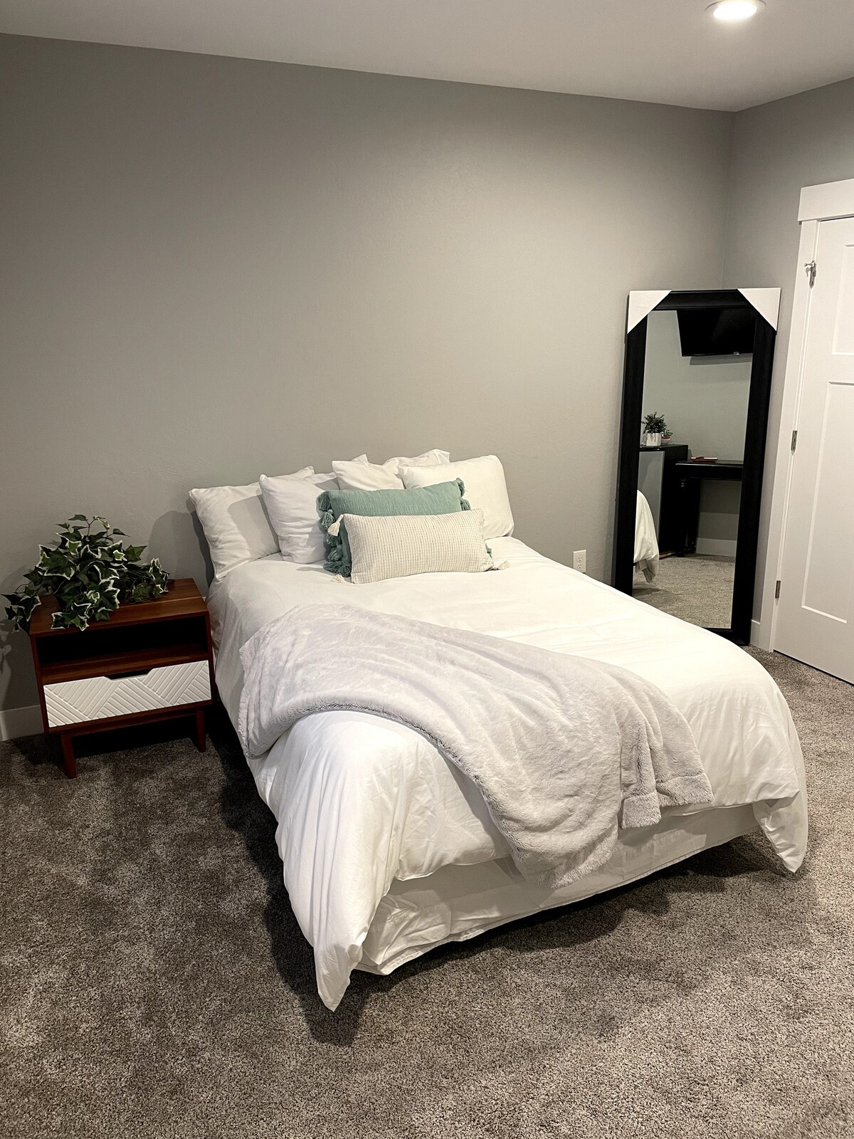 Home built in 2013. Bedroom in finished basement with Queen size bed, Pac & play available. Quiet neighborhood, has kitchen for use with electric stove, small frig, microwave, toaster oven. coffee maker. We will be working on adding items to use. Washer and dryer available for a fee.