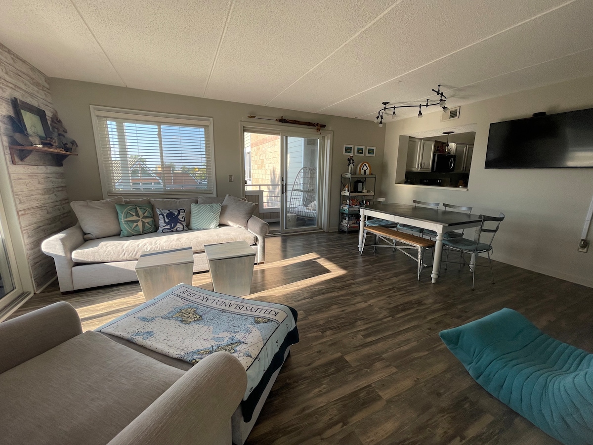 Apartment with large kitchen and common area living room. Deck is directly off the kitchen for El fresco dining and grilling.