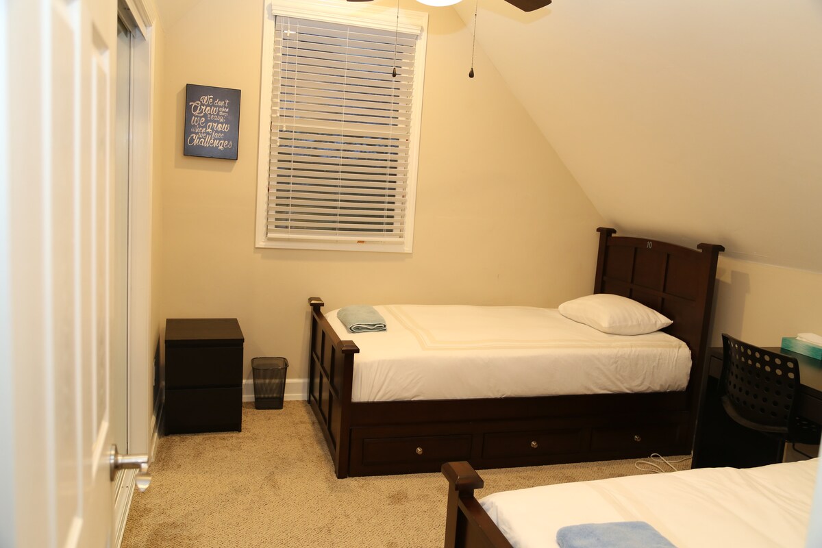 Engineer’s Paradise 9 is a single bed, on the right side of the room. The room is upstairs overlooking the backyard. There are 3 single twin beds in the room, one walking closets with bins, laundry basket and hangers, attic closets to store empty bags and bins to store personal belongings, 2 desks and chairs, ceiling fan and a window overlooking backyard giving the room natural light.