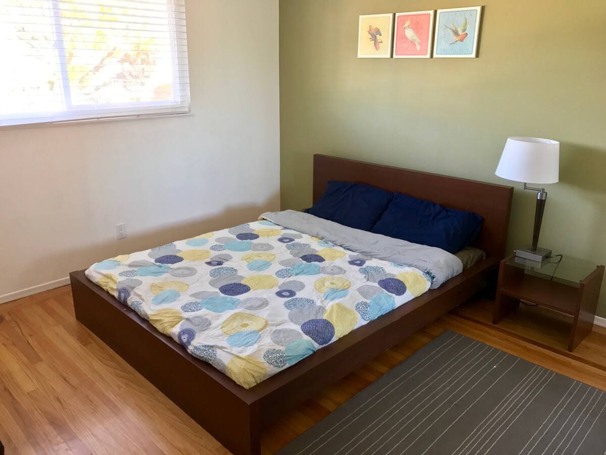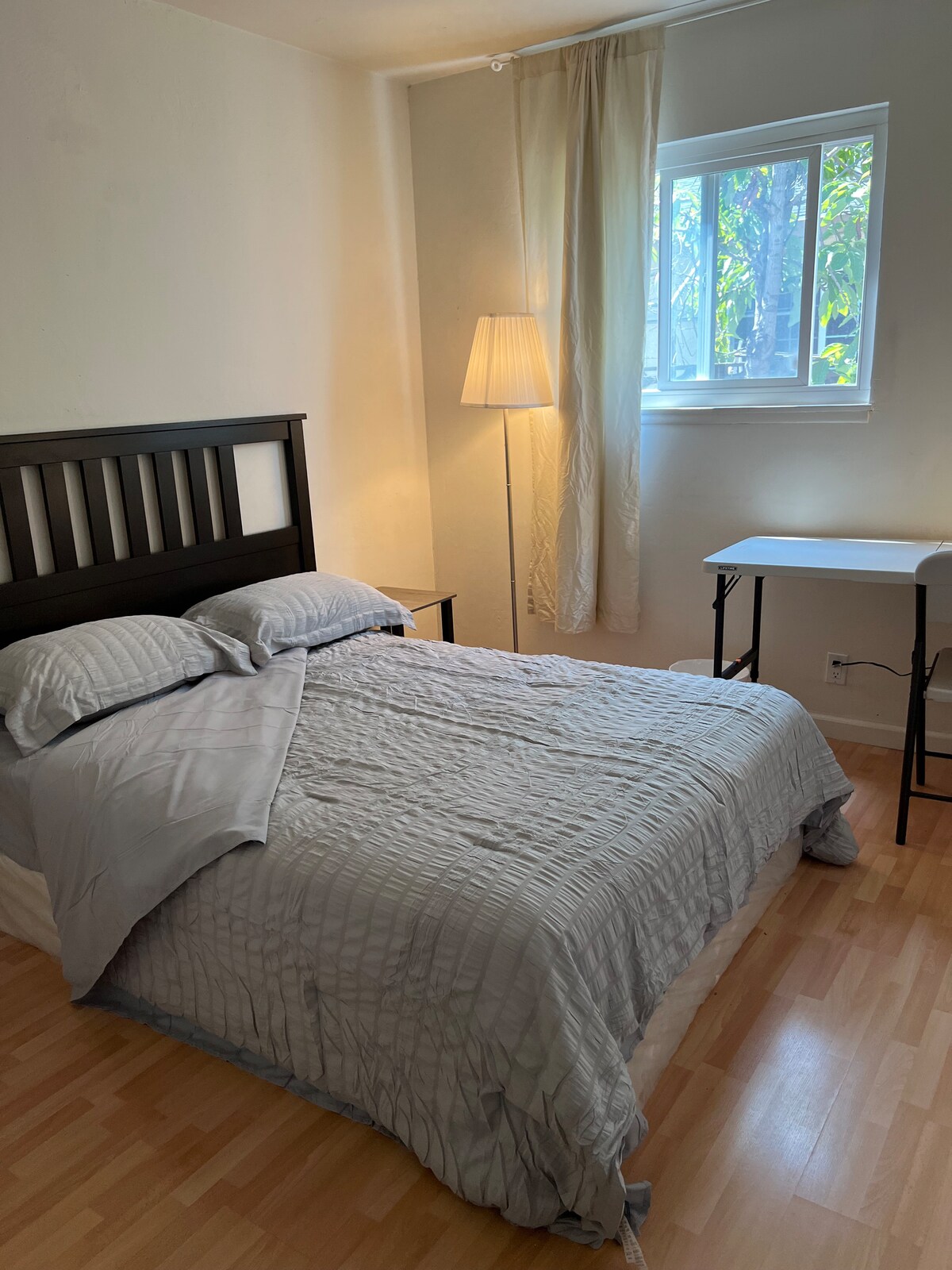 This is a bright and airy room with a sliding door closet. Room is furnished with a queen bed, mattress, night stand and lamps. The house is in a nice and quiet residential neighborhood.