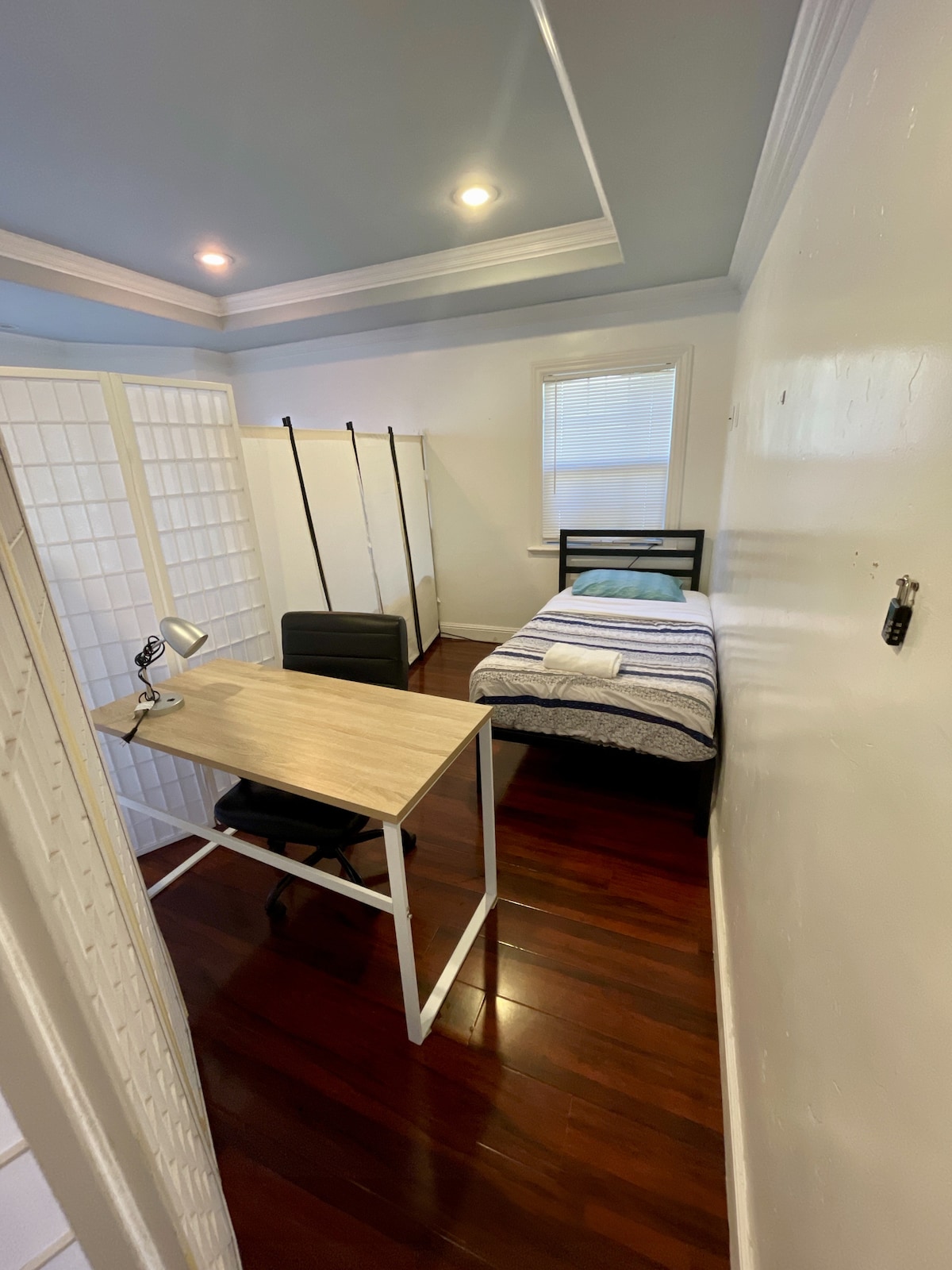 Engineer’s Paradise 11 is a single bed, on the right side of the room. The room is upstairs overlooking the front yard. There are 2 single twin beds in the room, one walking closets with lots of storage space, laundry basket and hangers, a desk and chair, ceiling fan and a window overlooking front yard giving the room natural light.