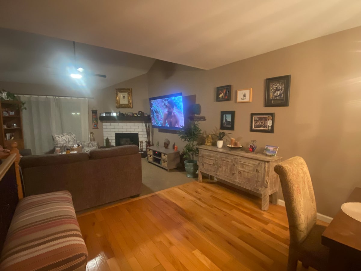 Living Room - Leather sectional centered around a vintage wood burning fireplace and bar area. Watch a movie, relax to the sounds of your favorite vinyl record, and pour yourself a drink at Evergreen Escape.
